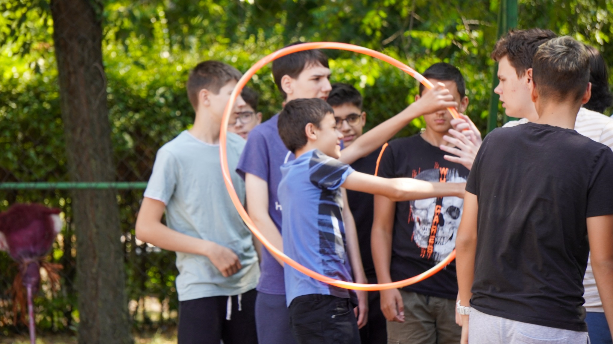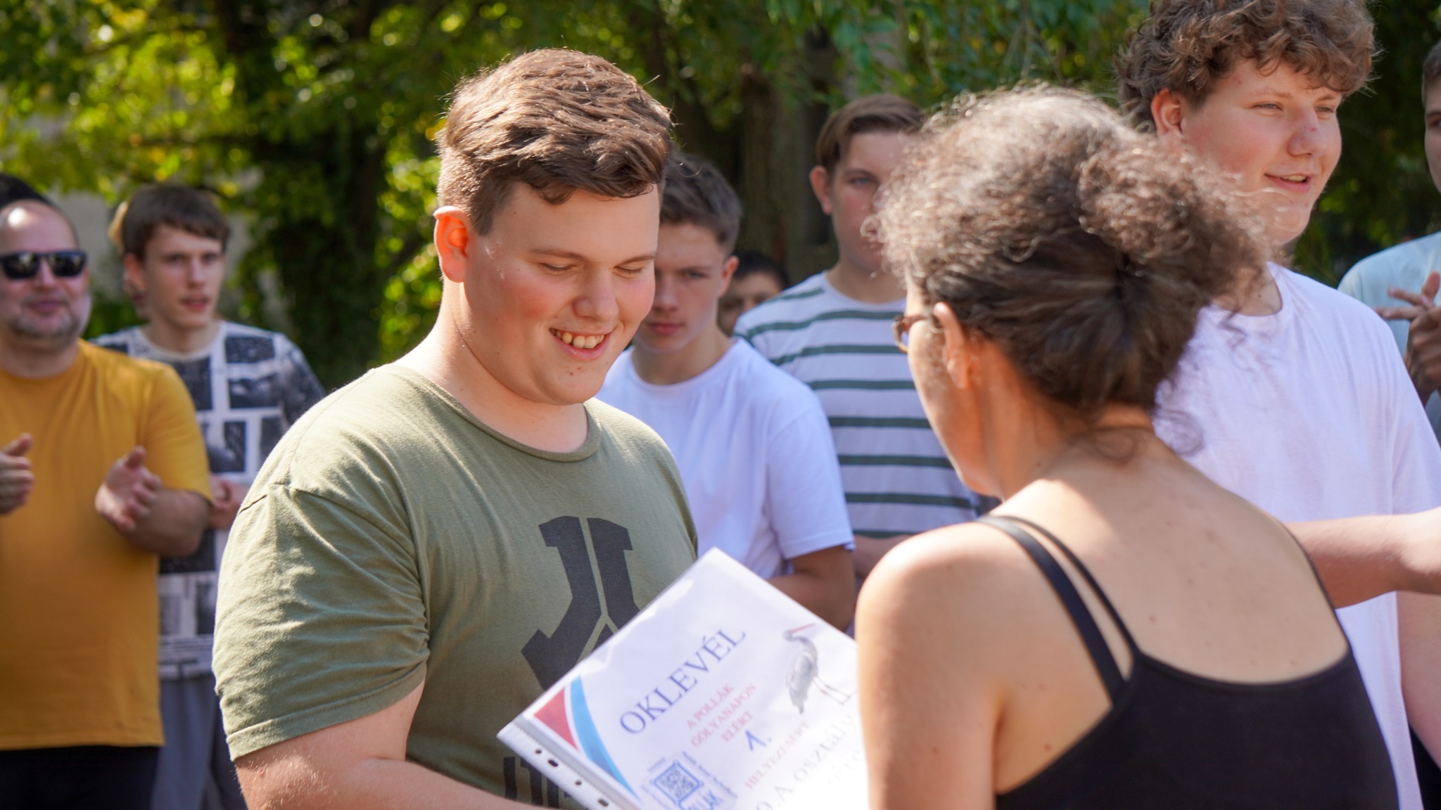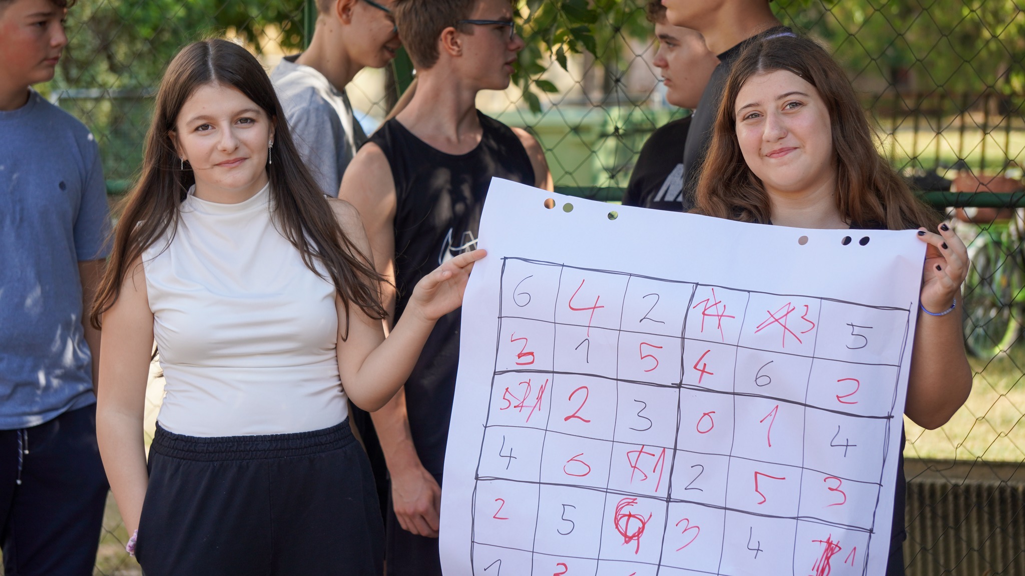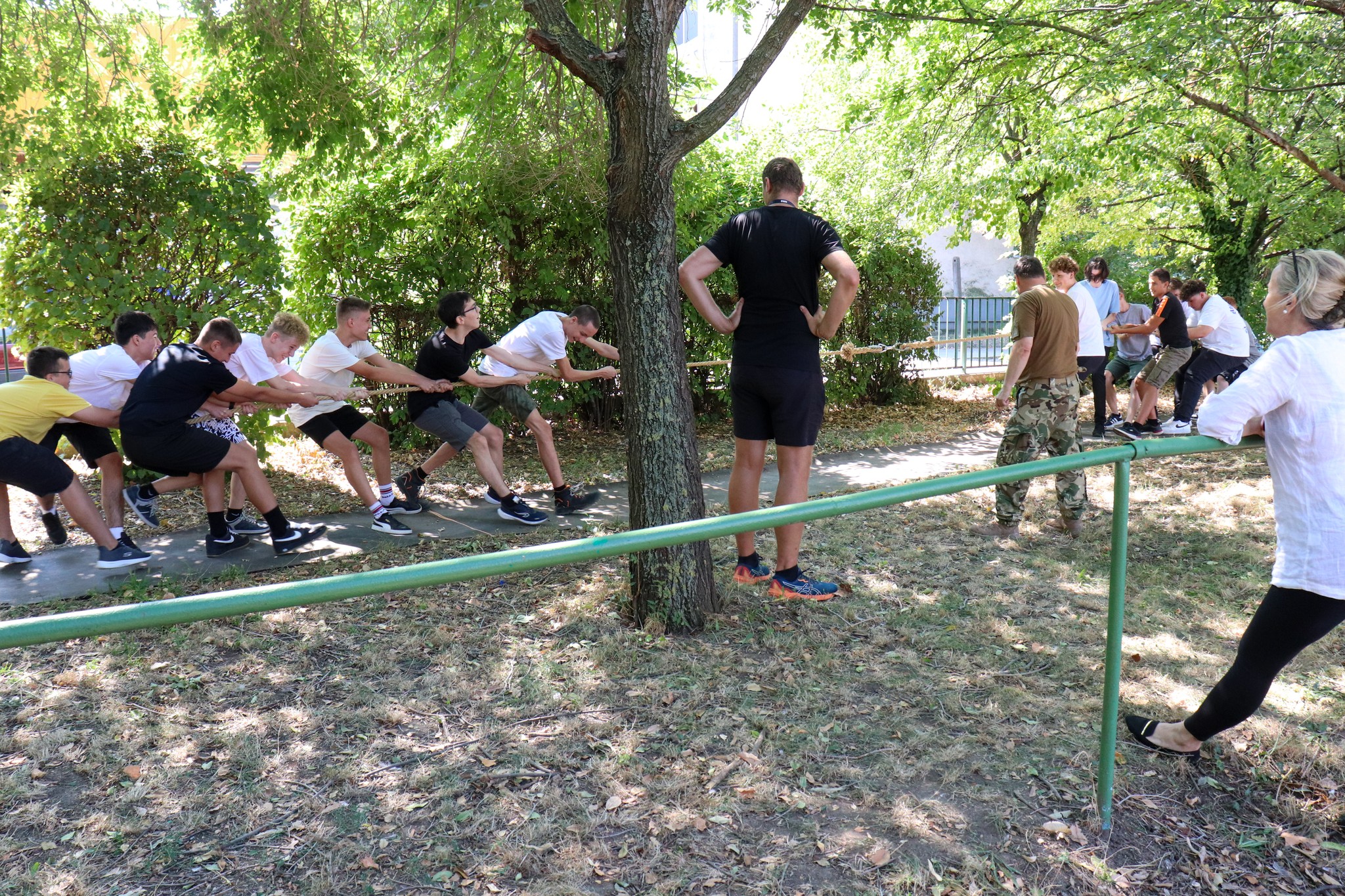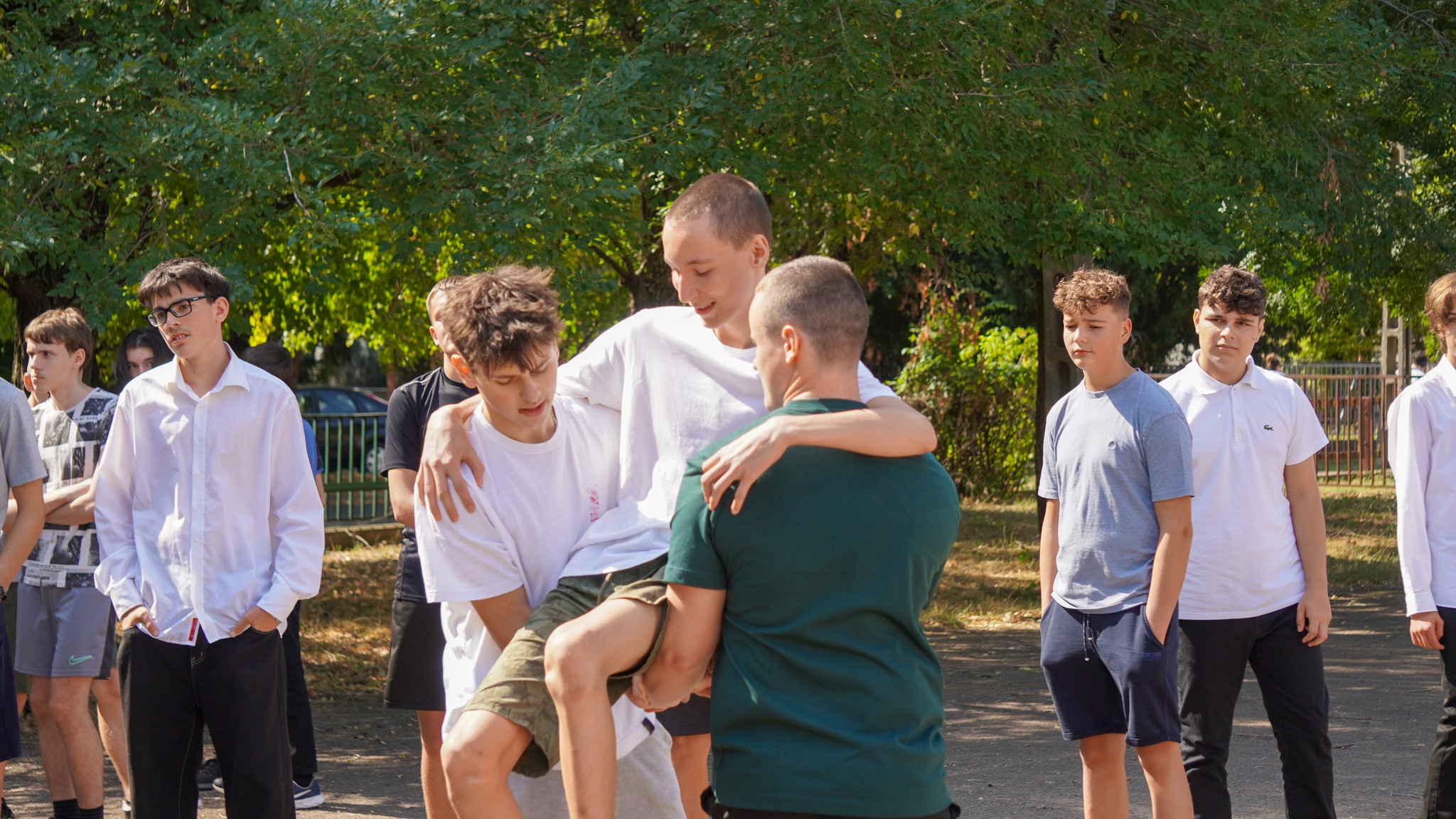 Hagyományainkhoz híven az első iskolai nap tanévnyitó ünnepsége és osztályfőnöki órái után vidám vetélkedővel csaltunk mosolyt még kicsit visszafogott 9. évfolyamosaink arcára. Oktatóink változatos feladatok (sudoku, szólánc, kötélhúzás, ügyességi játékok) elé állították „gólyáinkat”, amelyek szinte észrevétlenül csapattá formálták őket. Ezen az első megmérettetésen a 9.A osztály győzött, így legalább egy hónapig ők birtokolhatják iskolánk „totemét”, Pollák Pityut, de az októberi gólyaavatón a 9.B-nek minden esélye megvan a visszavágásra! 🤘