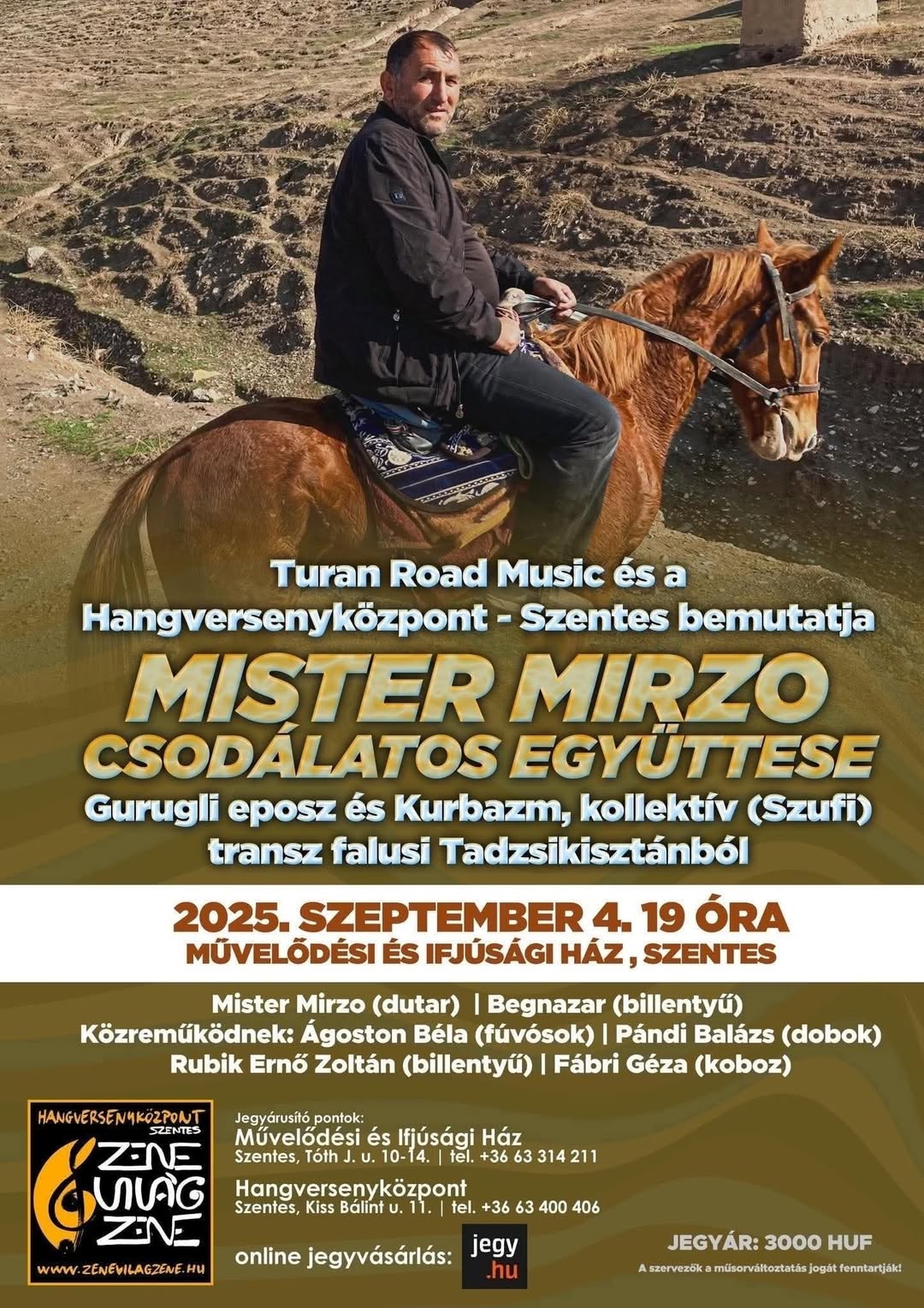 Mister Mirzo Tadzsikisztánból érkezik, hagyományos falusi közegből, ahol jórészt esküvőkön és más ünnepségeken (toj/tor) játszik, ad elő a Gurugli eposzból tadzsik (perzsa) nyelven részleteket dutar pengetős hangszerén kísérve sajátos torokénekét. A tadzsik vidéki kultúra híres figurája, hőse, aki csapatával a lovas polo közép-ázsiai változatának (buz-kasi/kök-pare/köböre/ulak) versenyein vesz részt nagy sikerrel (a kecske vagy kisborjú testét, kell elragadnia magával a lovasnak csapattársai segítségével). A falujában (Csolto) nagy hagyománya van a(z egyéni és kollektív!!!) zenélésnek, számos kiváló zenész él itt, köztük unokatestvére Begnazar (billentyű), akikkel együtt falusi tadzsik zenét játszanak, melyre nagy hatással van a pamiri (badahsani) és afgán zenekultúra, annál is inkább, mivel őseik a szomszédos térségből érkeztek mostani lakóhelyükre, Csolto-ba. Az egyik ilyen zenét Kurbazen-nek hívják, mely gyakorlatilag egy egy kollektív (Szufi) transzként fogható fel, egy olyan zenei formára utalva, melybe több zenész modern és hagyományos hangszerekkel, énekkel, valamint tánccal kapcsolódik be, segít a hallgatóságnak elfeledni a mindennapok gondját-baját. Ezekbe a mélységekbe kapunk betekintést a koncert során a Turán Road Music zenekar új és régi tagjainak részvételével: Ágoston Béla – fúvósok, Pándi Balázs – dob, Rubik Ernő – billentyű és Fábri Géza – koboz.