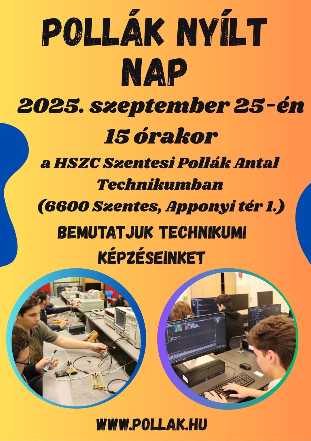 A továbbtanulás előtt álló diákokat és szüleiket várja a HSZC Szentesi Pollák Antal Technikum szeptember 25-én, csütörtökön, 15 órától a szentesi Apponyi téren található intézményben.