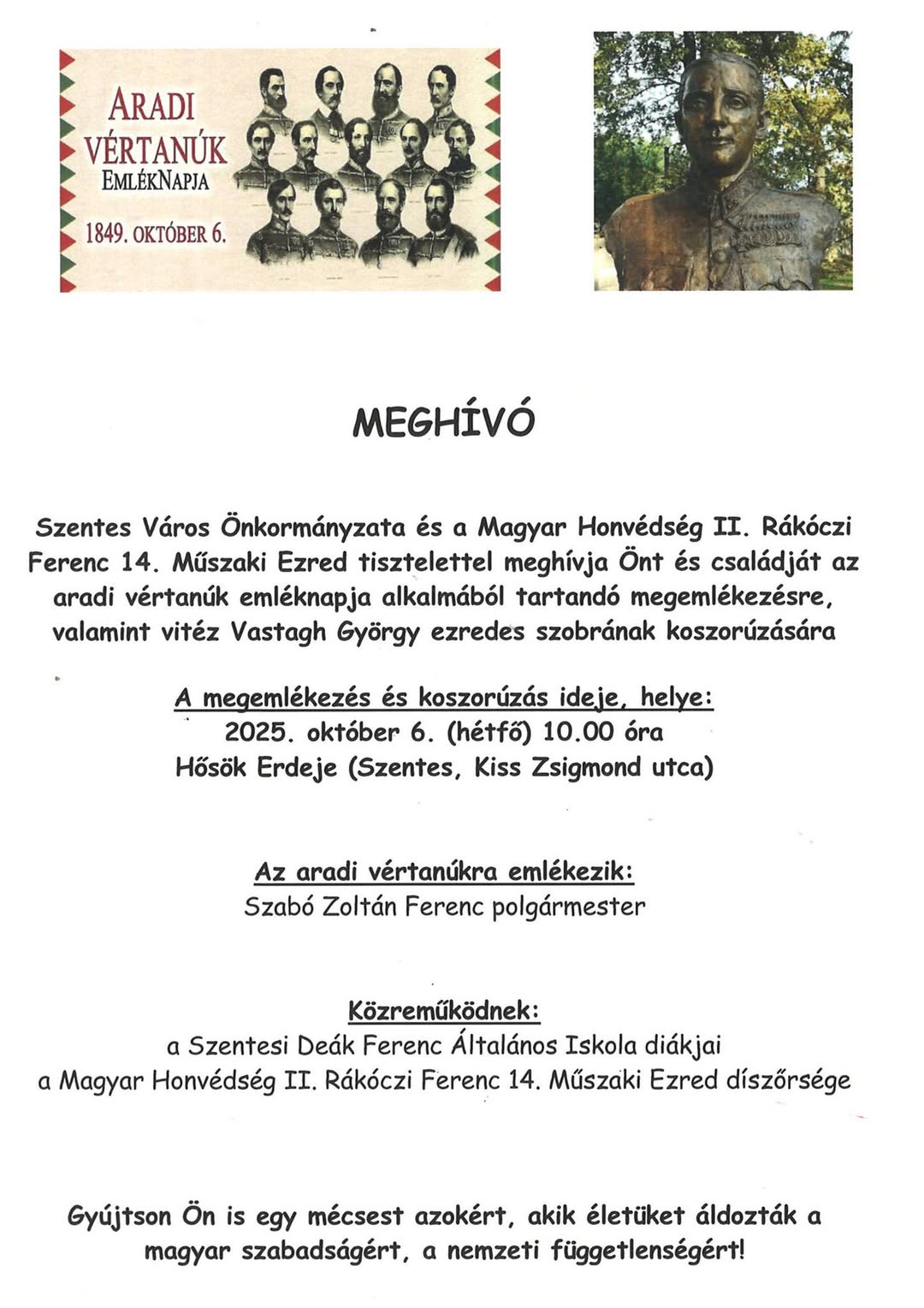 Szentes Város Önkormányzata és a Magyar Honvédség II. Rákóczi Ferenc 14. Műszaki Ezred tisztelettel meghívja a lakosságot az aradi vértanúk emléknapja alkalmából tartandó ünnepi megemlékezésre és koszorúzásra.