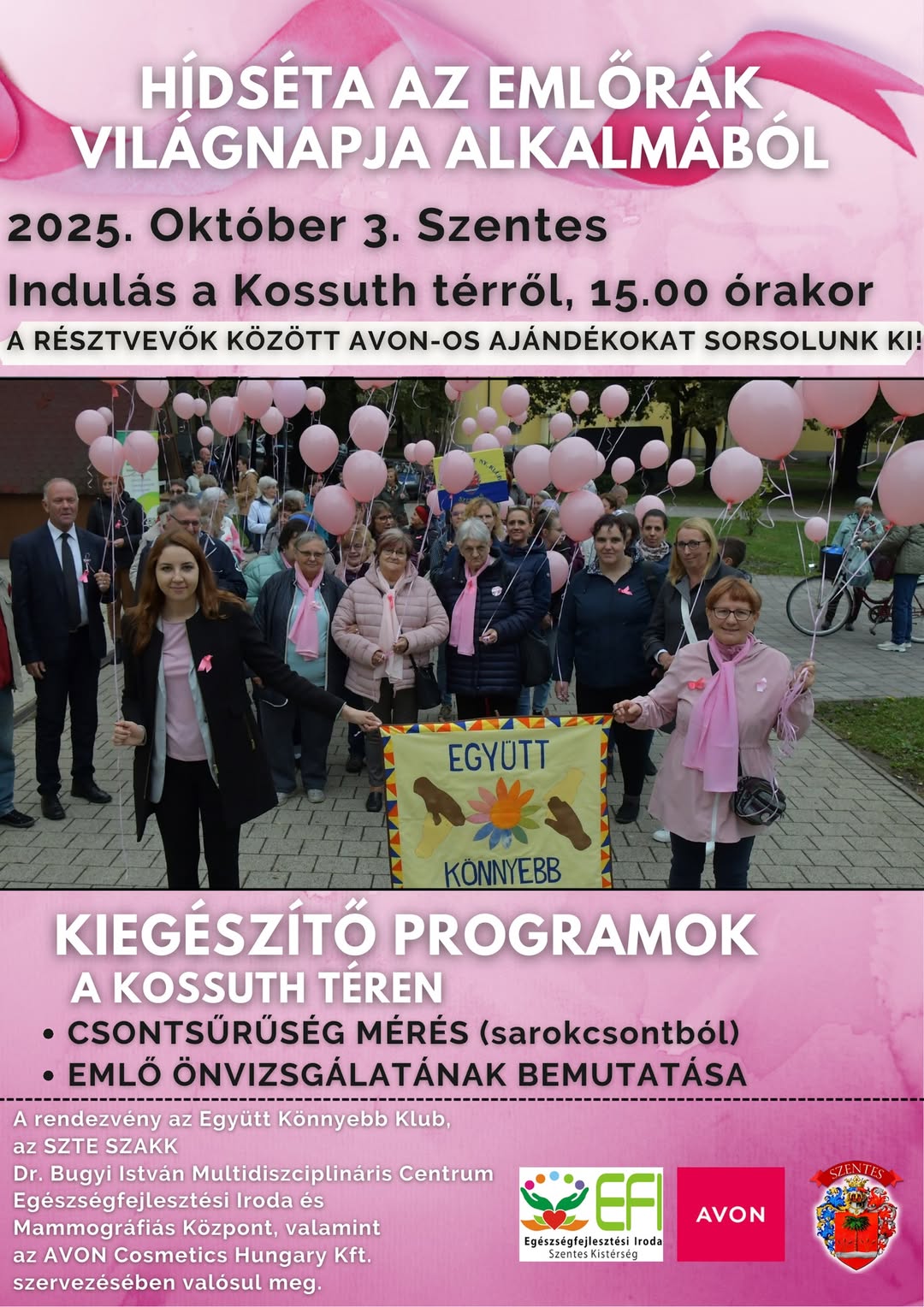 Október 3-án, pénteken az SZTE SZAKK Dr. Bugyi István Multidiszciplináris centrum Egészségfejlesztési Irodája, az Együtt Könnyebb Klubbal karöltve, valamint az SZTE SZAKK Dr. Bugyi István Multidiszciplináris Centrum – Mammográfiás Központ munkatársainak közreműködésével, az emlőrák világnapja alkalmából hídsétát szervez, hogy közösen hívja fel a figyelmet a megelőzés és a szűrés fontosságára.