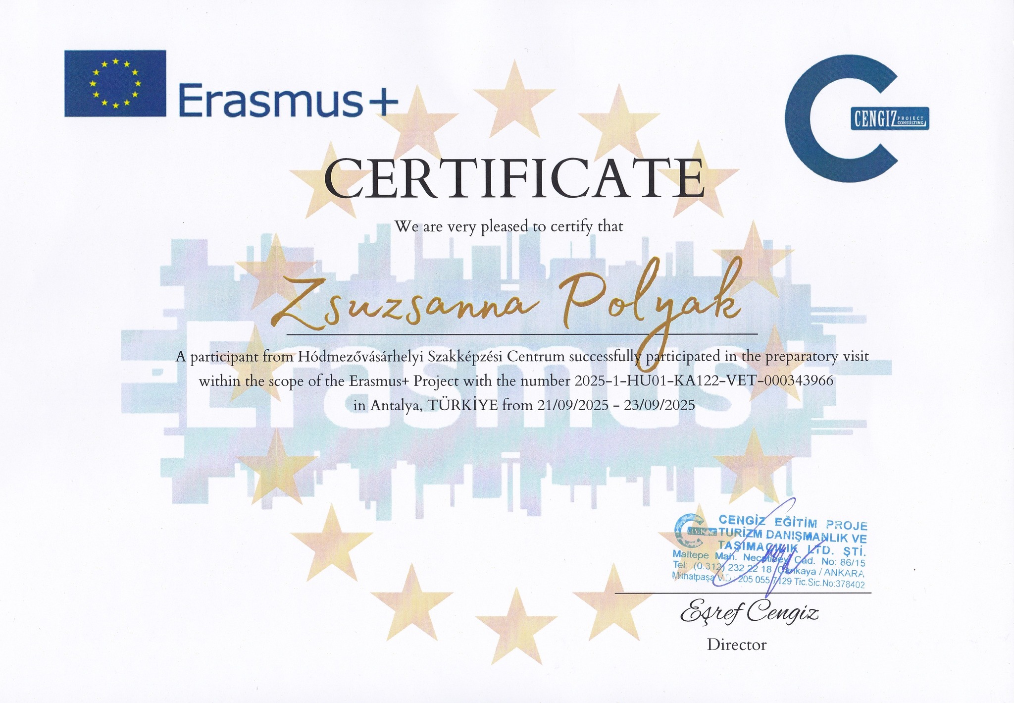Izgatottan jelentjük, hogy Kresmájer Szilvia és Polyák Zsuzsanna oktatónk Side-Manavgat városában, Törökországban járt, hogy előkészítse a diákok számára tervezett ERASMUS+ szakmai gyakorlatot a Cengiz Proje fogadóintézménynél.