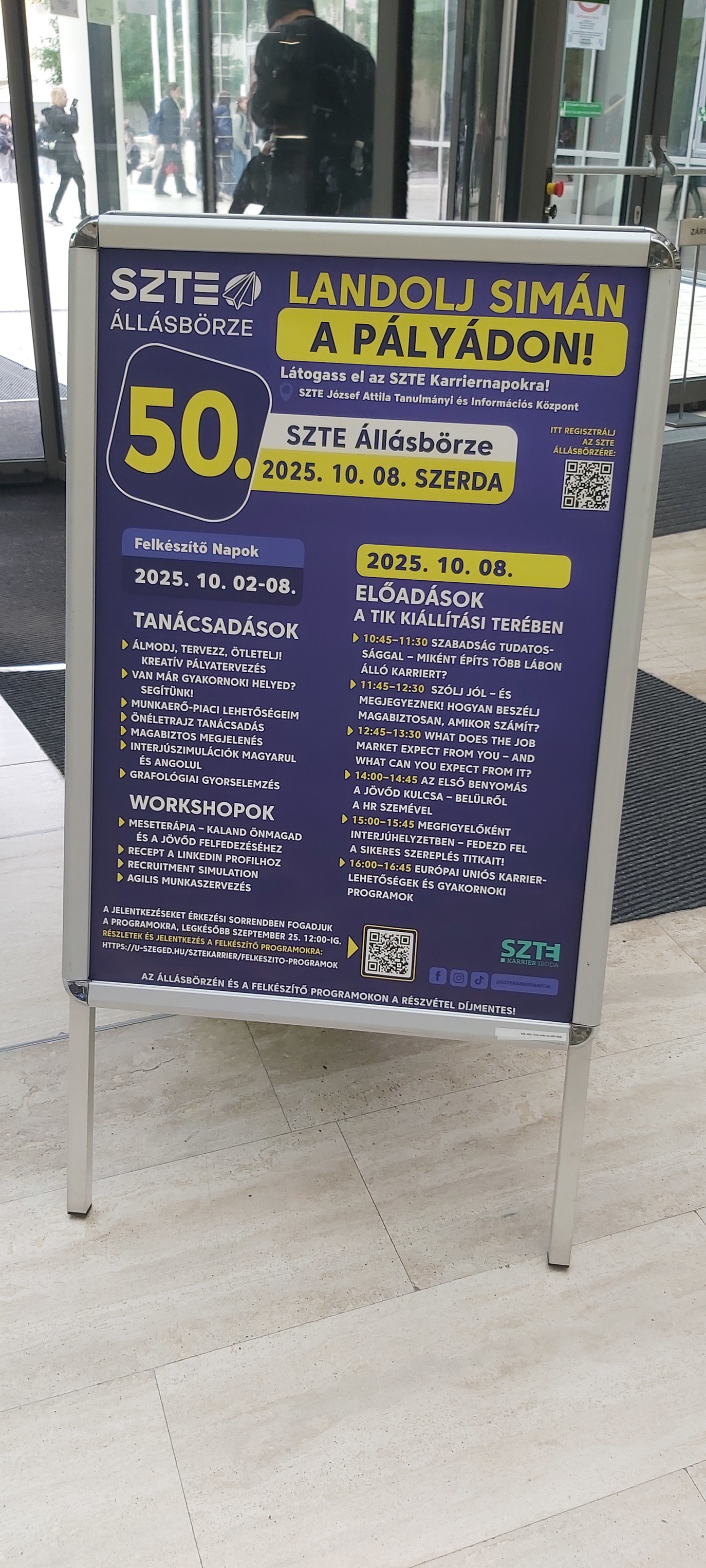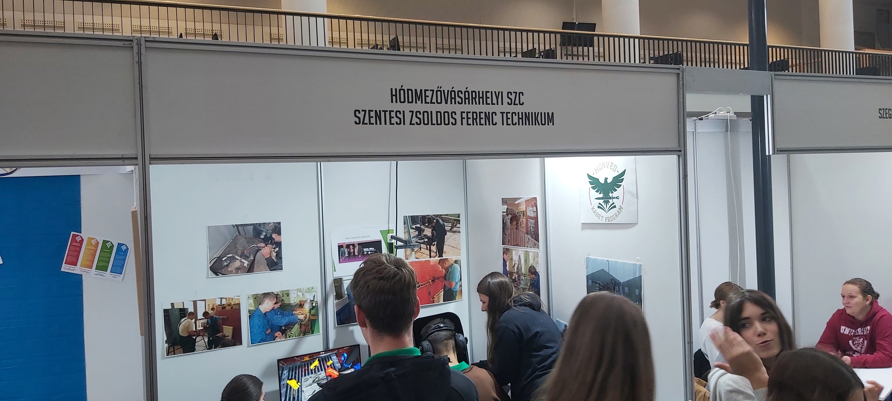 Iskolánk, a HSZC Szentesi Zsoldos Ferenc Technikum idén is részt vett a Szegedi Tudományegyetem és a Csongrád-Csanád Vármegyei Kormányhivatal közös szervezésében megrendezett Pályaválasztási Napok rendezvénysorozaton, amelyre 2025. október 9–11. között került sor a Szegedi Tudományegyetem József Attila Tanulmányi és Információs Központjában (TIK).