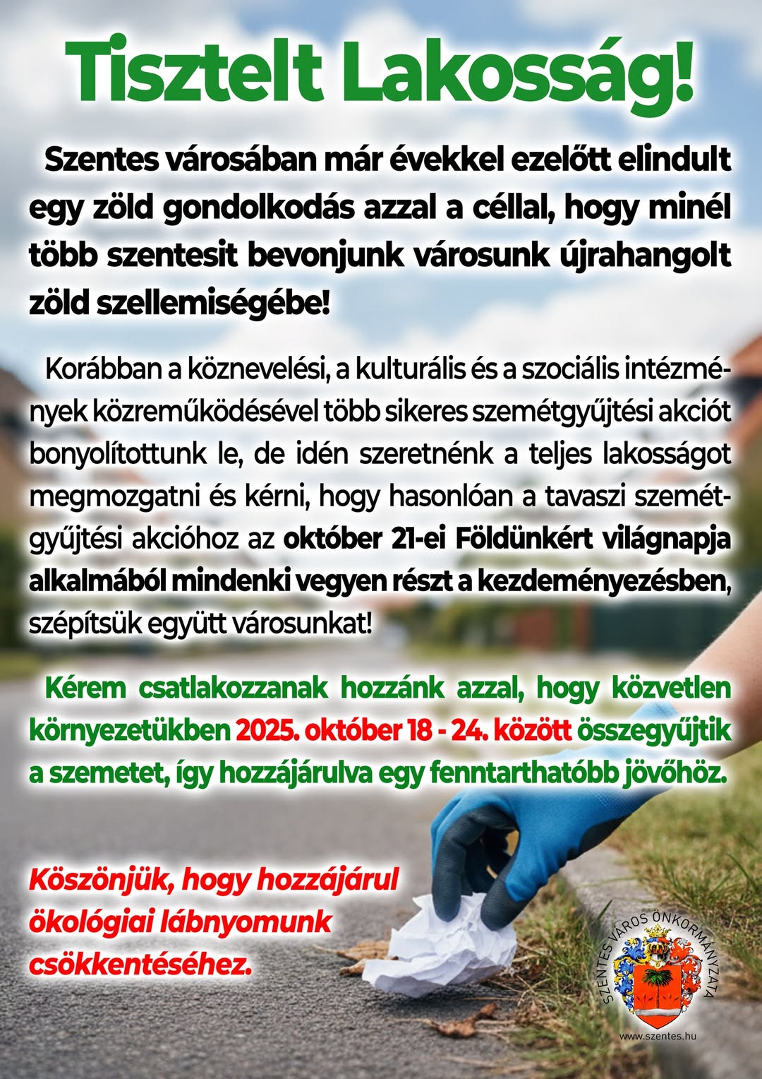 Kérem csatlakozzanak hozzánk azzal, hogy közvetlen környezetükben 2025. október 18 – 24. között összegyűjtik a szemetet, így hozzájárulva egy fenntarthatóbb jövőhöz.