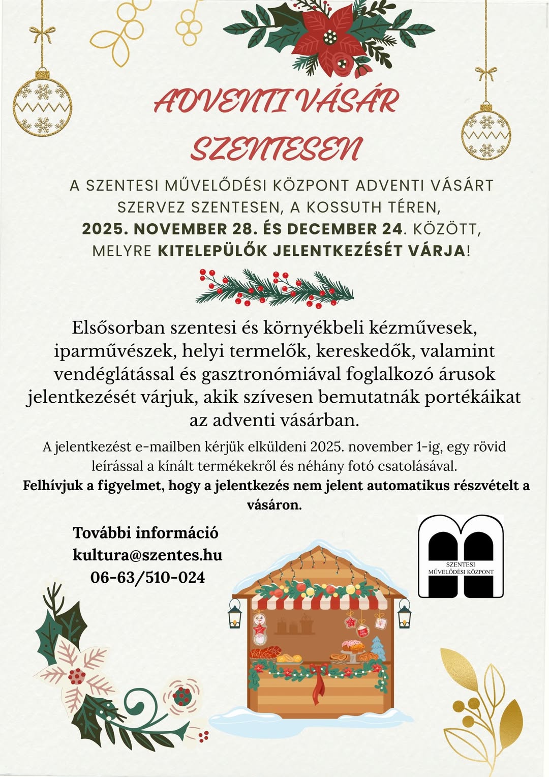 Kezdőlap Kultúra és szórakozás Szentesi Művelődési Központ Adventi Vásár Szentesen!…