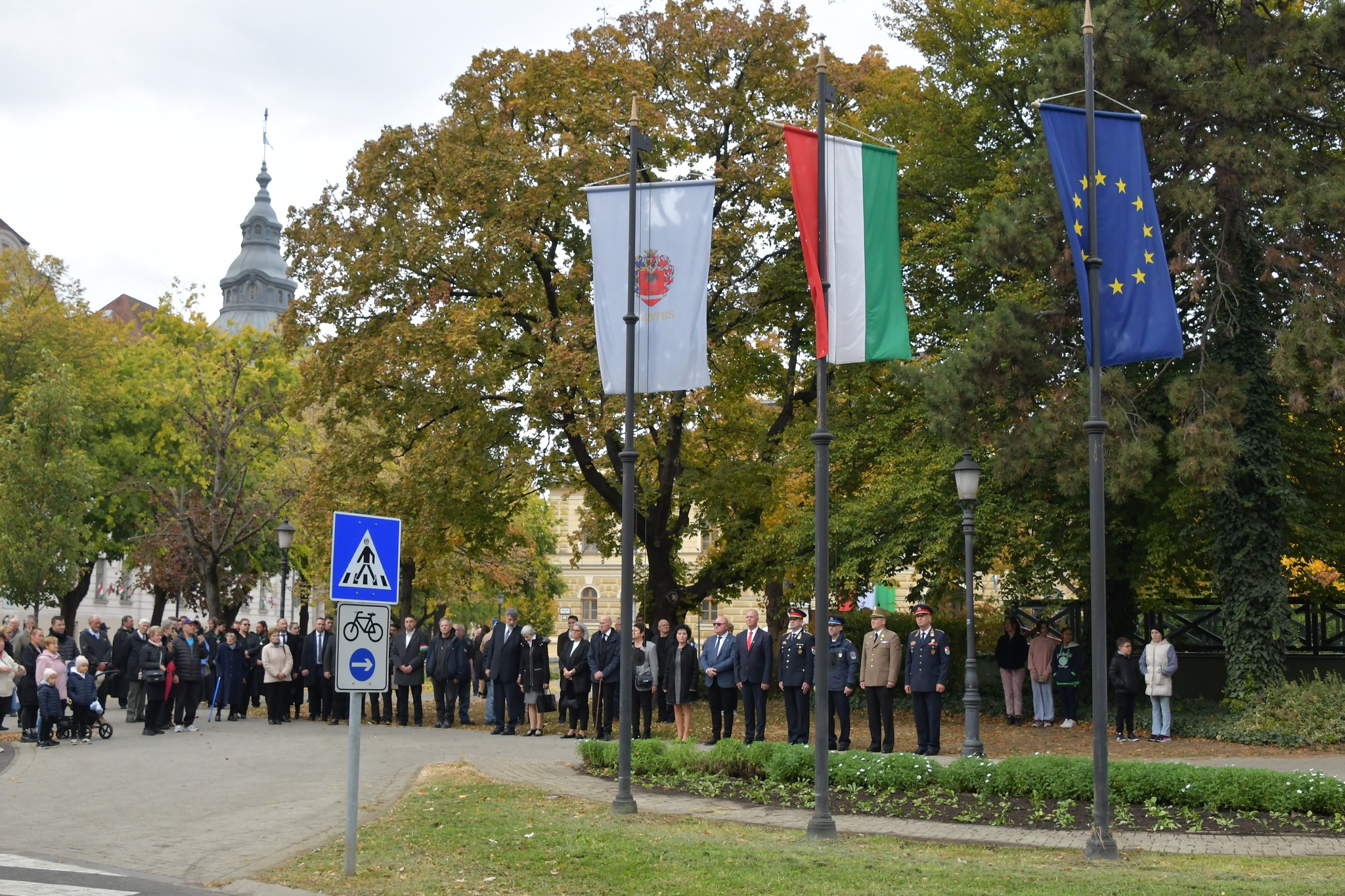 A városi ünnepség a Kossuth téren folytatódott a nemzeti és városi lobogó felvonásával.