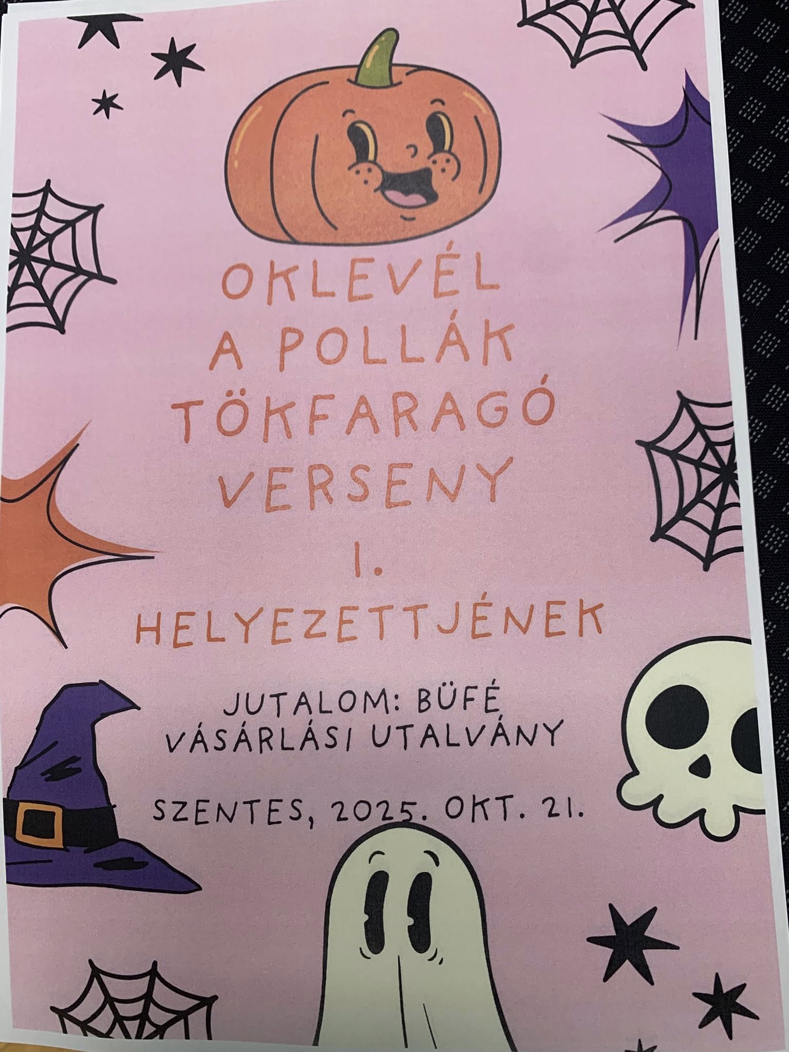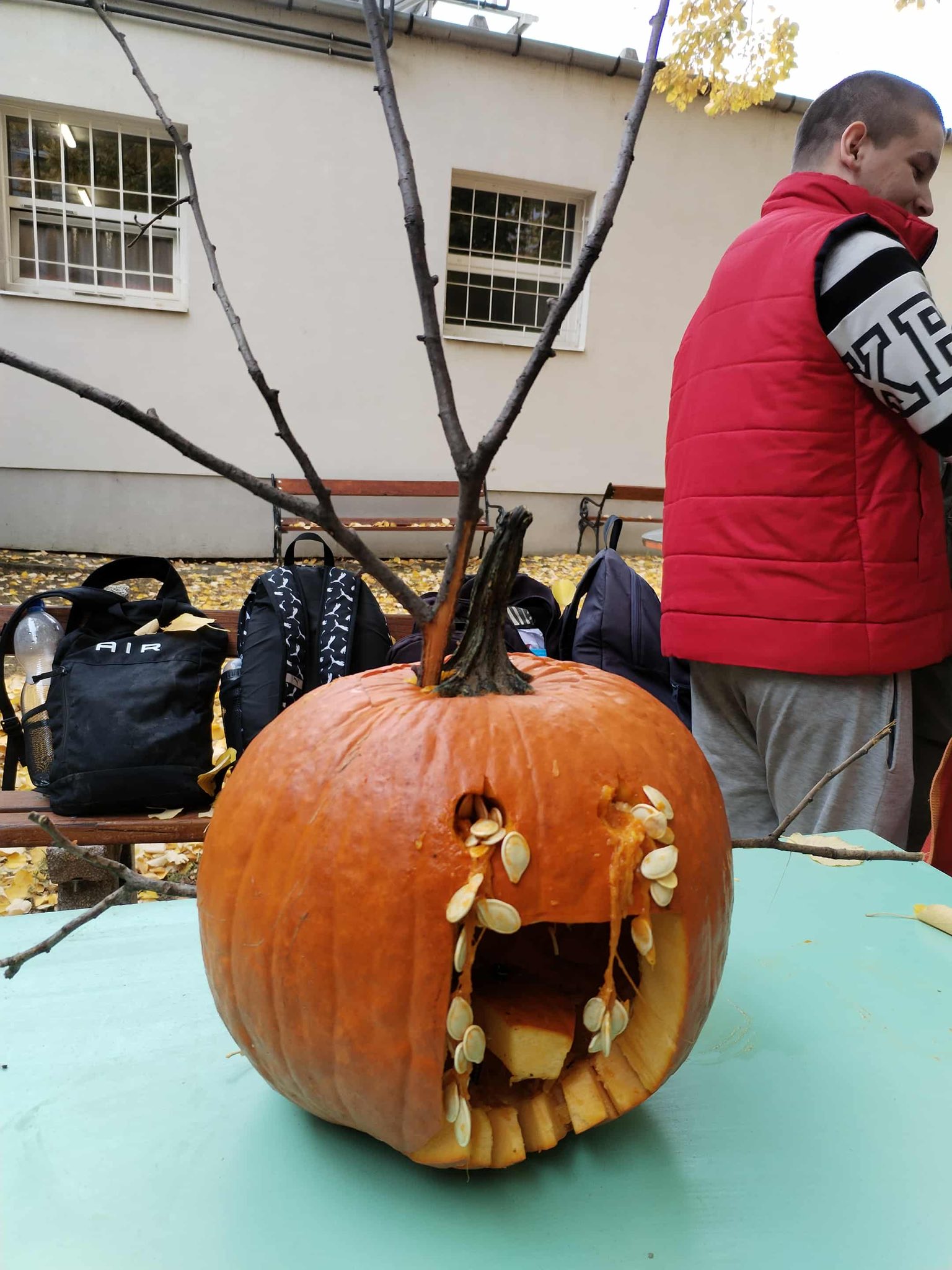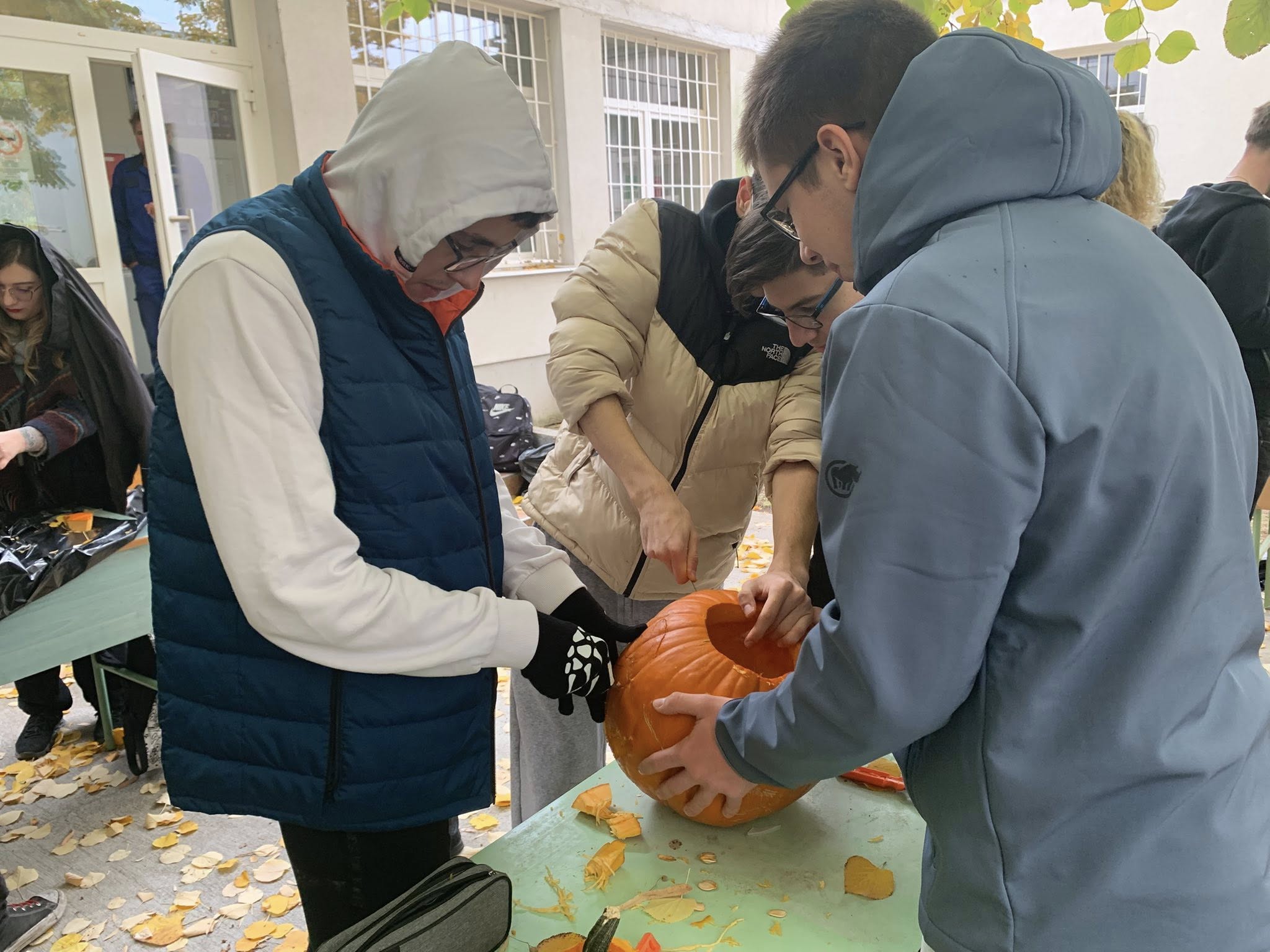 Az őszi szünet kezdete előtt, október 21-én tartottuk meg iskolánkban a jelmezes tökfaragó versenyt. Igazi őszi időjárásban, csepergő esőben tizenhárom csapat gitárszóra mérkőzött meg az udvaron, majd zsűrizés után az elkészült versenyműveket a bejáratnál állítottuk ki.