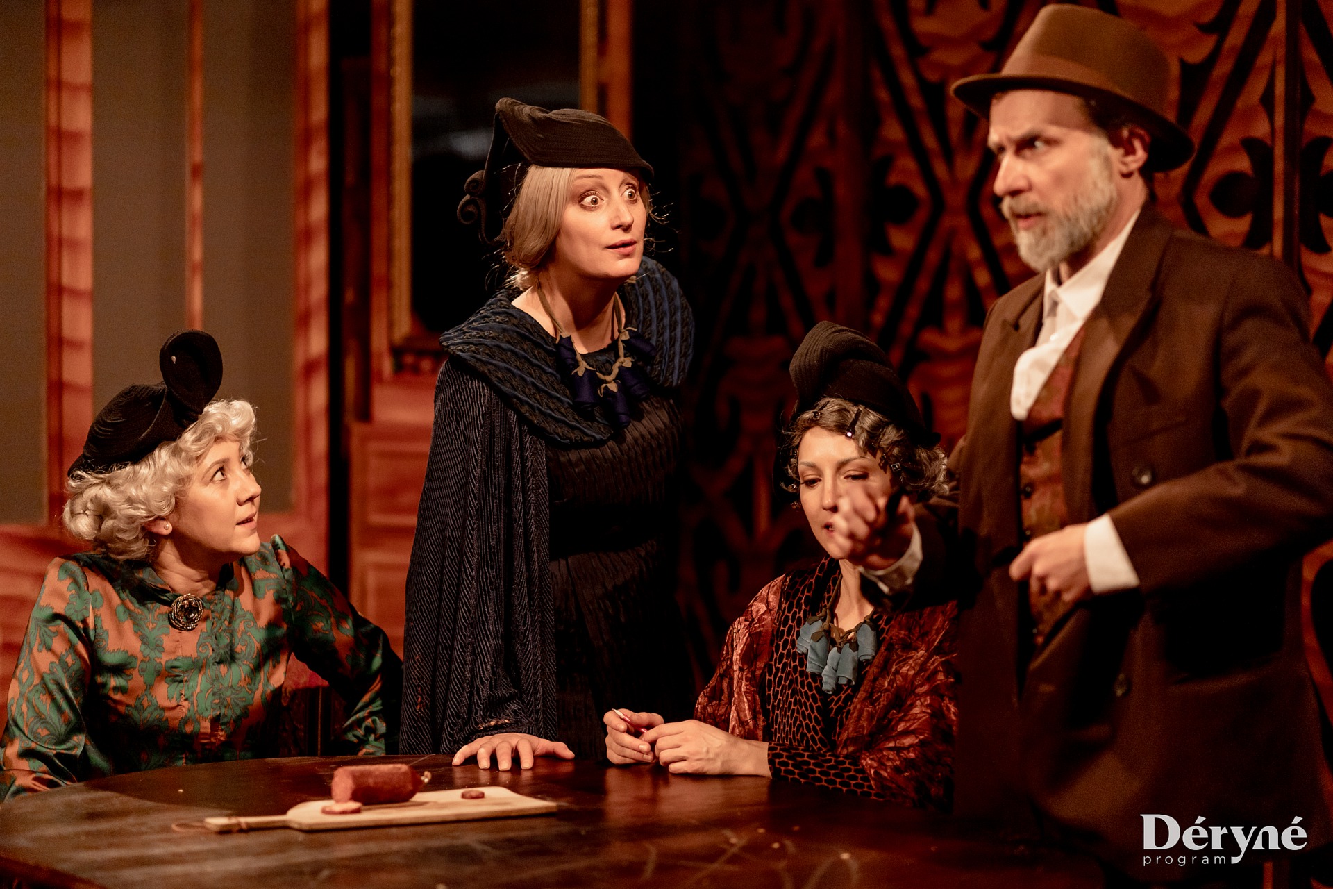 Nincs függöny a darab kezdetén, belépünk a cigányzenével permetezett nézőtérre, azonnal kocsmában érezzük magunkat, pedig később kiderül, hogy az egy nagybirtokosi kúria szalonterme. Remek a hangulat, mindenki részegen rogyadozik, dülöngél, vagy szunyókál, az asztalokon borosüvegek. Aztán egy kendős, tűzrőlpattant menyecske jelent meg tálcával a kezében, kolbászt és kenyeret, majd pálinkát kínált a közönségnek. Remek ötlet!
