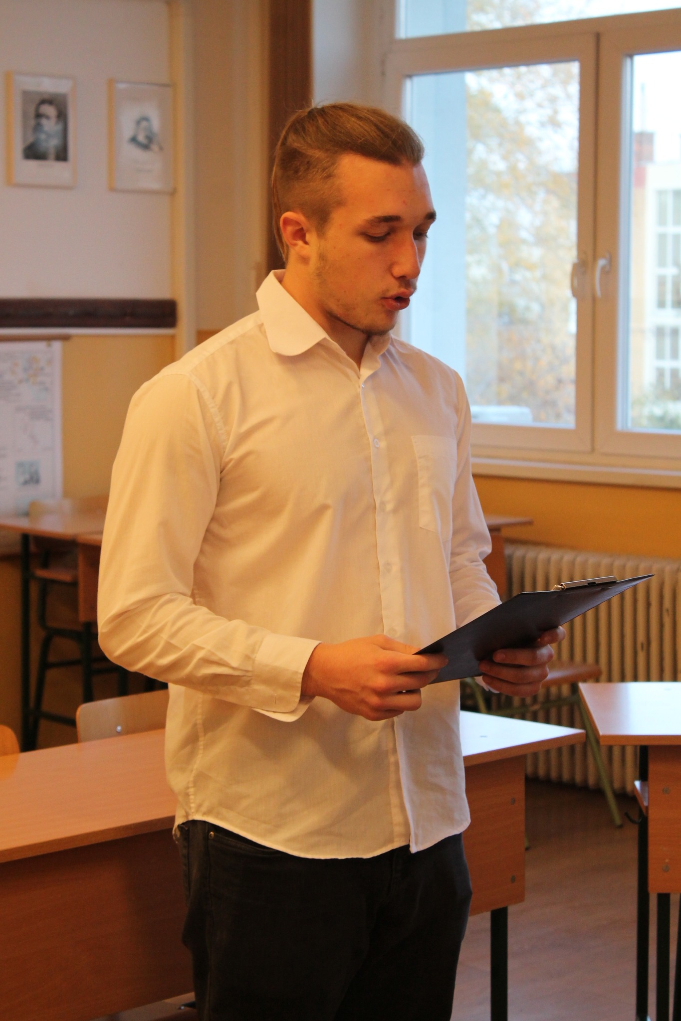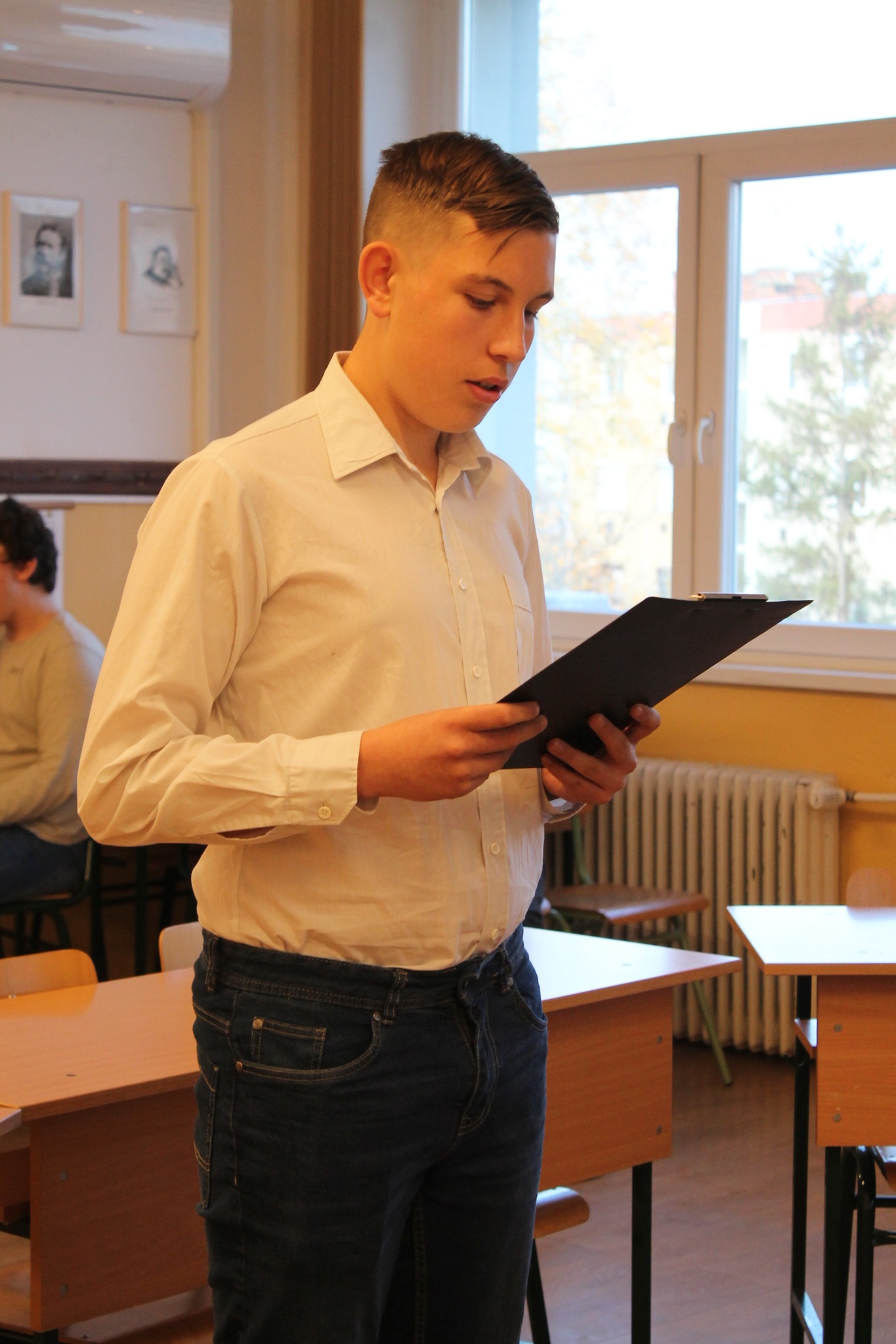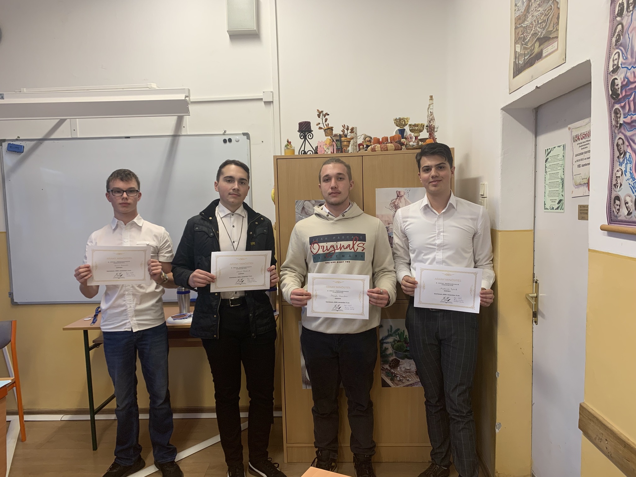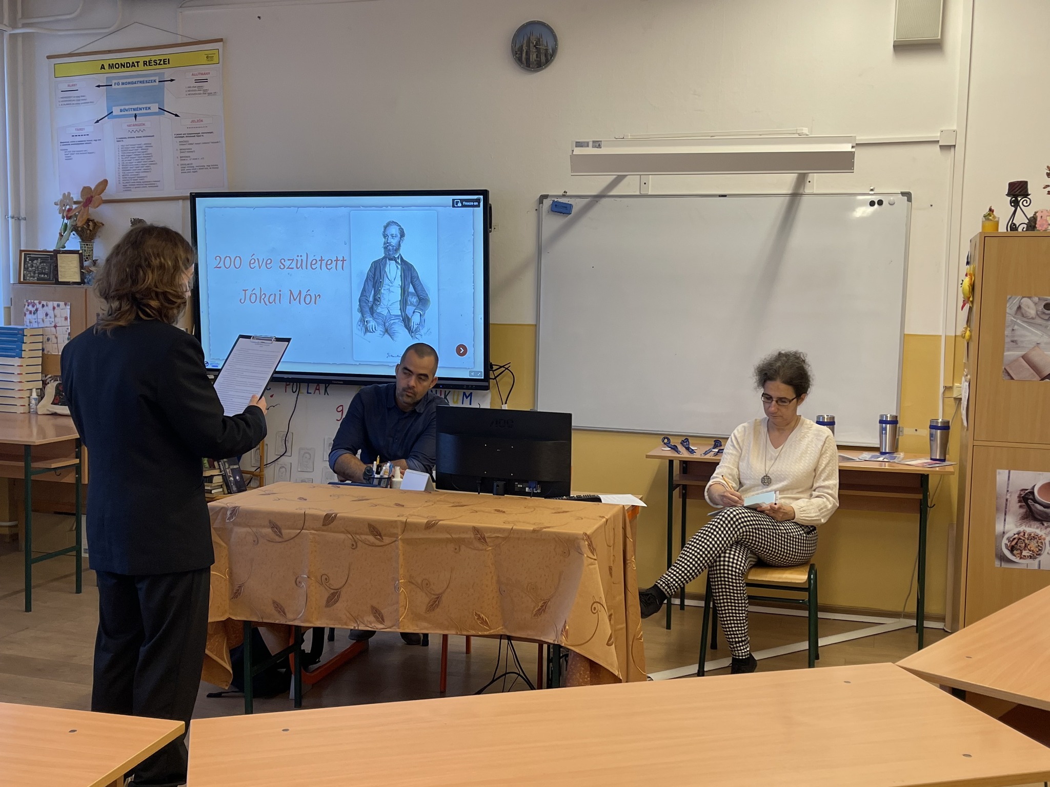November 11-én rendeztük meg iskolánkban azt a Jókai-emlékversenyt, amelyben a „legnagyobb mesélő” tiszteletére minden 9-12. évfolyamos osztály képviselője a Melyiket a kilenc közül? című novella egy részletét szólaltatta meg. A szervezők törekedtek arra, hogy a hangulatot süteménnyel, üdítővel családiassá varázsolják, de emellett a kellő ünnepélyességet is biztosítsák. Az összes résztvevőt tantárgyi dicséret, elismerő oklevél és tárgyi jutalom illeti, de értő olvasásával, érzelemgazdagságával kiemelkedett a mezőnyből az a négy diák, aki arany minősítést szerzett: Madarász Patrik (12.B osztály), Benyhe Zsombor (11.A osztály), Ökrös Botond (10.A osztály) és Rácz Botond (9.B osztály). Gratulálunk versenyzőinknek, és köszönjük az iskola Jókai-projekt koordinátorának, Bagi Lászlónak a munkáját! 👏