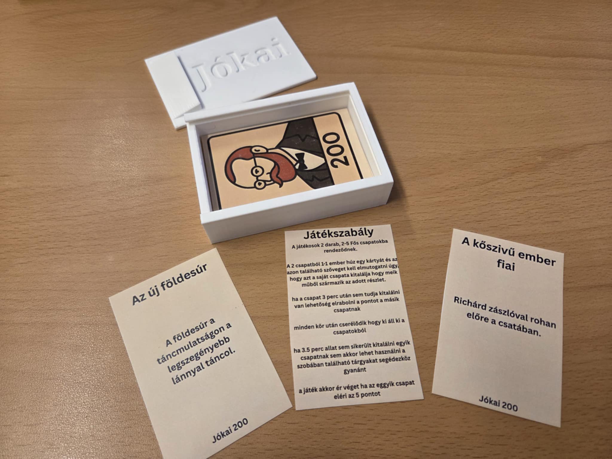 Révész Balázs és Koós Gergő különféle IKT-eszközök felhasználásával a középiskolai tananyagon alapuló kártyajátékot álmodott meg, melynek tervezése során 3D-nyomtatót, grafikai tervezőt és AI-t is bevetettek. Az elkészült kártyajáték irodalomórákon is felhasználható lesz, tehát sokan élőben is kipróbálhatják majd a Jókai-kártyajátékot. ☺️