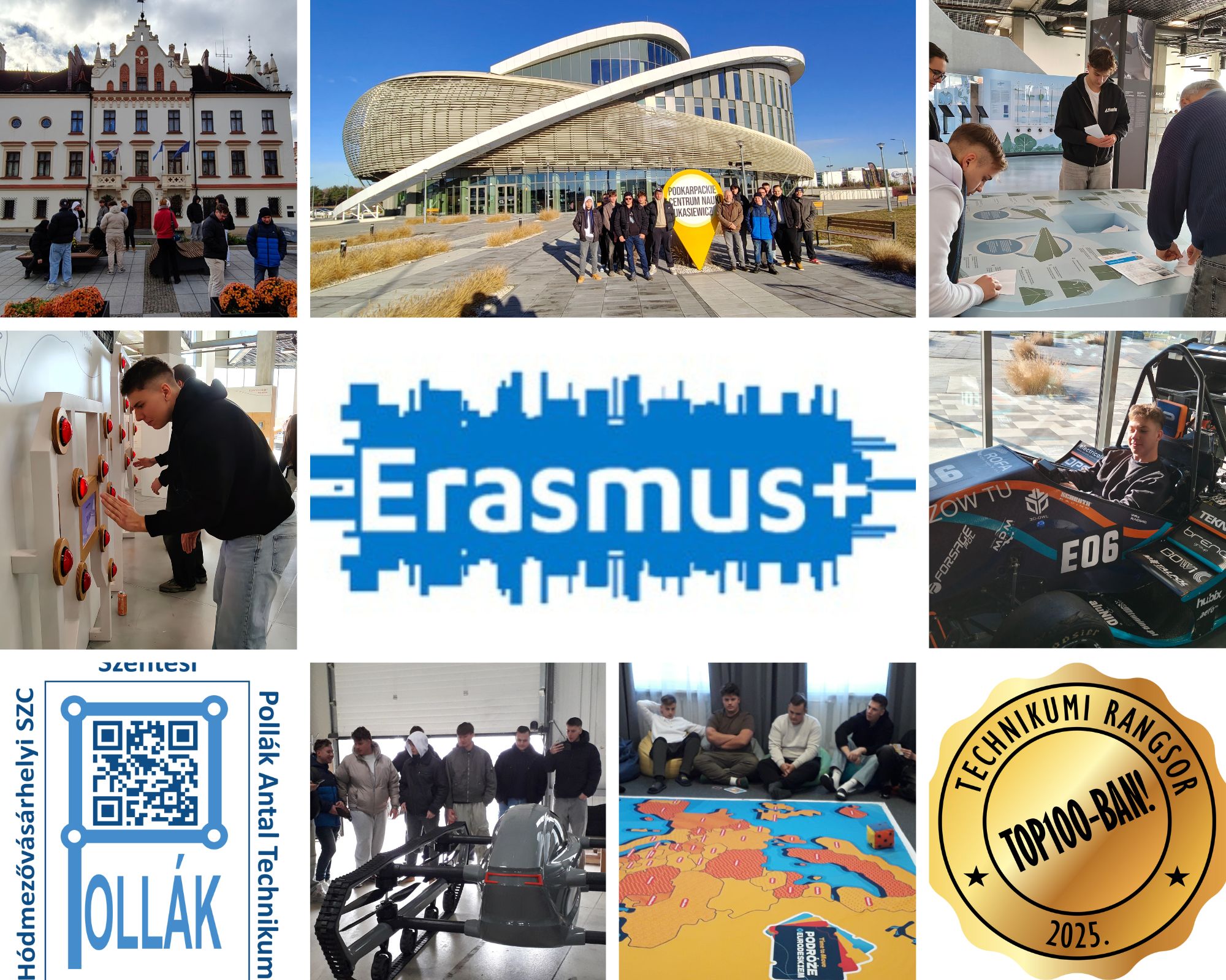 Élményekben gazdag 12-13. évfolyamos elektronikás diákjaink lengyelországi útja. Felfedezték Rzeszów történelmi belvárosát, majd a „Podkarpackie Centrum Nauki Łukasiewicz” interaktív látogatóközpontban ismerkedtek a repülés fizikájával, az energiatermelés változatosságával, és még marsjárót is vezethettek. Később két startup cég működésébe is betekinthettek: a „B Tecnology” drónfejlesztő cégnél a jövő földön-vízen-levegőben is használható újdonságainak fejlesztését láthatták testközelből, a másik helyszínen pedig a legfejlettebb CNC gépekkel és nagy pontosságú 3D koordináta mérőgépekkel ellenőrzött térdprotézis öntőforma készítését figyelhették meg. Délutánonként