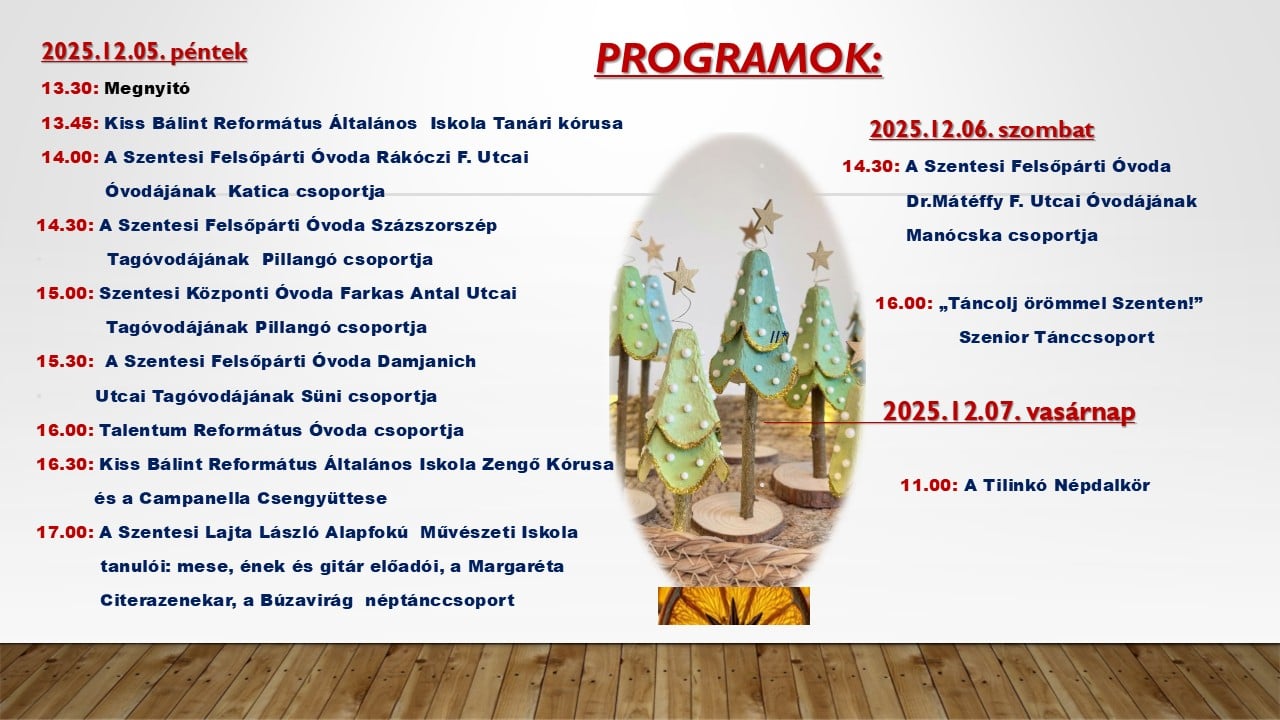 Szentesi alkotók munkáinak kiállítása és vására a Kapocs Egyesület és a Szentesi Művelődési Központ szervezésében. Ezen kívül a városi óvodások és iskolás csoportok adventi műsorokkal is készülnek. 🎄