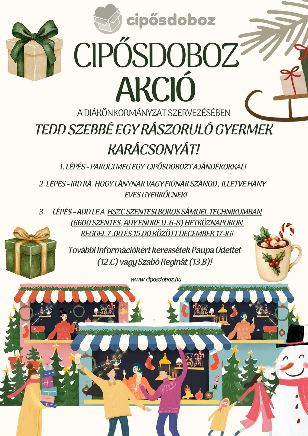 A HSZC Szentesi Boros Sámuel Technikum Diákönkormányzata idén is csatlakozott a cipősdoboz akcióhoz, amelynek célja, hogy minél több rászoruló gyermekhez jusson el egy szeretettel összeállított karácsonyi ajándék. A kezdeményezéshez bárki csatlakozhat: csak egy üres cipősdobozra, néhány kedves meglepetésre és egy apró feliratra van szükség, amely jelzi, milyen korú és nemű gyermeknek szánjuk az ajándékot.