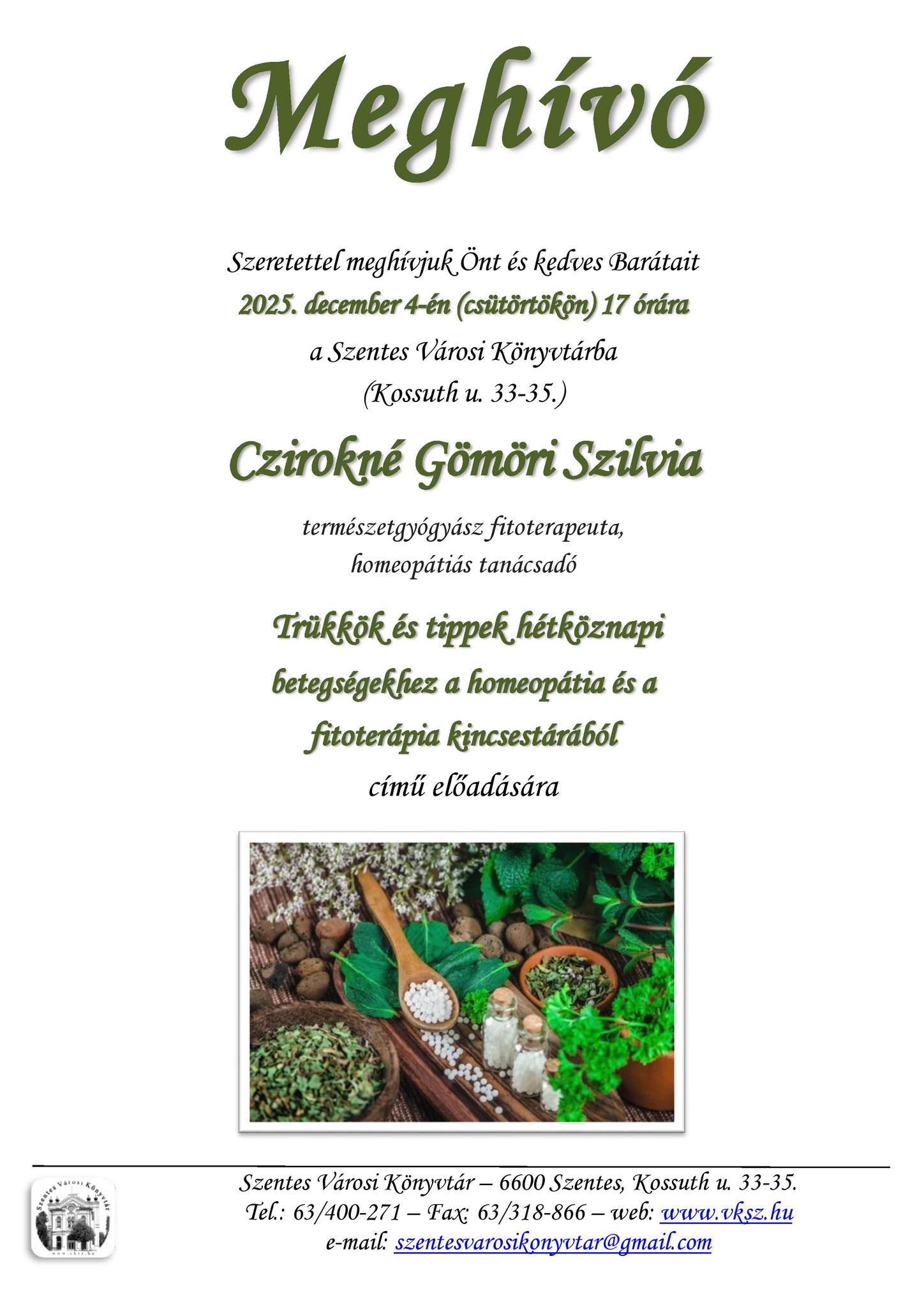 🔹17.00 Czirokné Gömöri Szilvia előadása: Trükkök és tippek hétköznapi betegségekhez a homeopátia és a fitoterápia kincsestárából