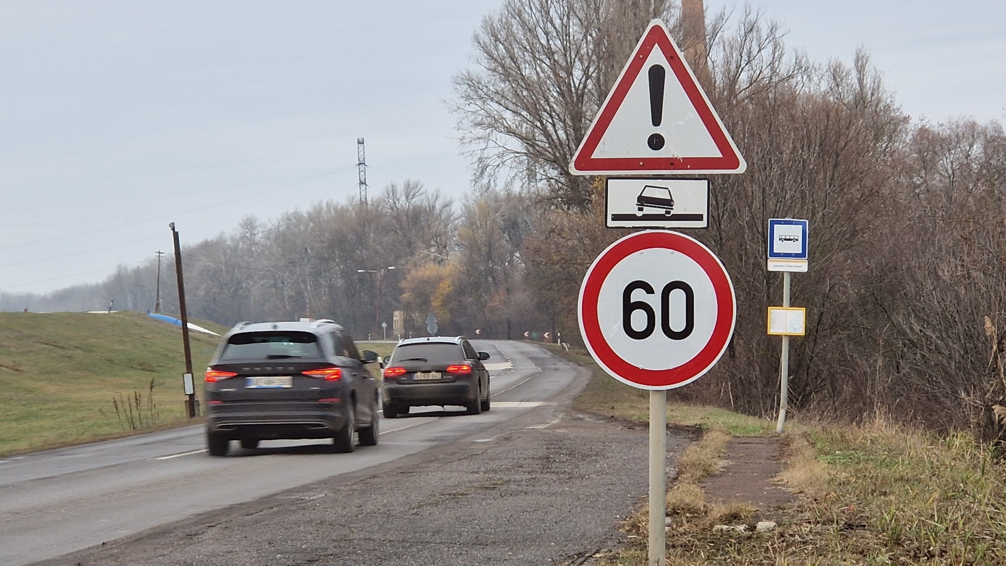 A Szentes és Csongrád közötti 451-es úton – a szivattyútelep mellett – megoldották a régóta fennálló problémát: a kátyúkat, nyomvályúkat, illetve a fél útpálya leszakadását továbbra sem javították meg… de kihelyeztek egy 60-as sebességkorlátozó táblát.