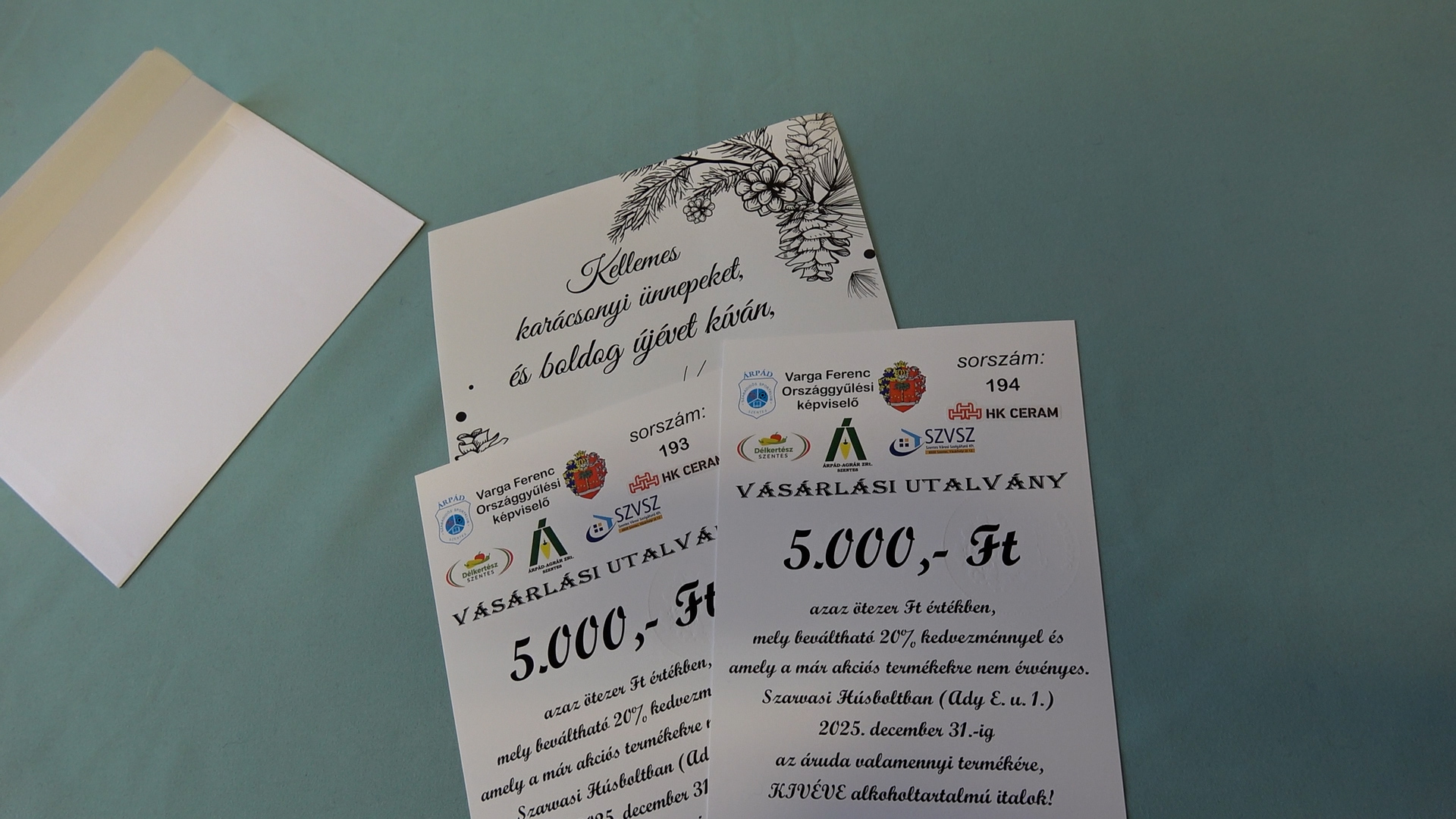 A szentesi önkormányzat és több helyi cég (HK Ceram, Árpád-Agrár Zrt., Délkertész, Szentes Városi Szolgáltató, Szarvasi Húsbolt) támogatásával, valamint az előző évhez hasonlóan a legmagasabb összeggel, fél millió forinttal hozzájáruló Varga Ferenc országgyűlési képviselő segítségével valósulhatott meg az ajándékutalványok átadása december 20-án.