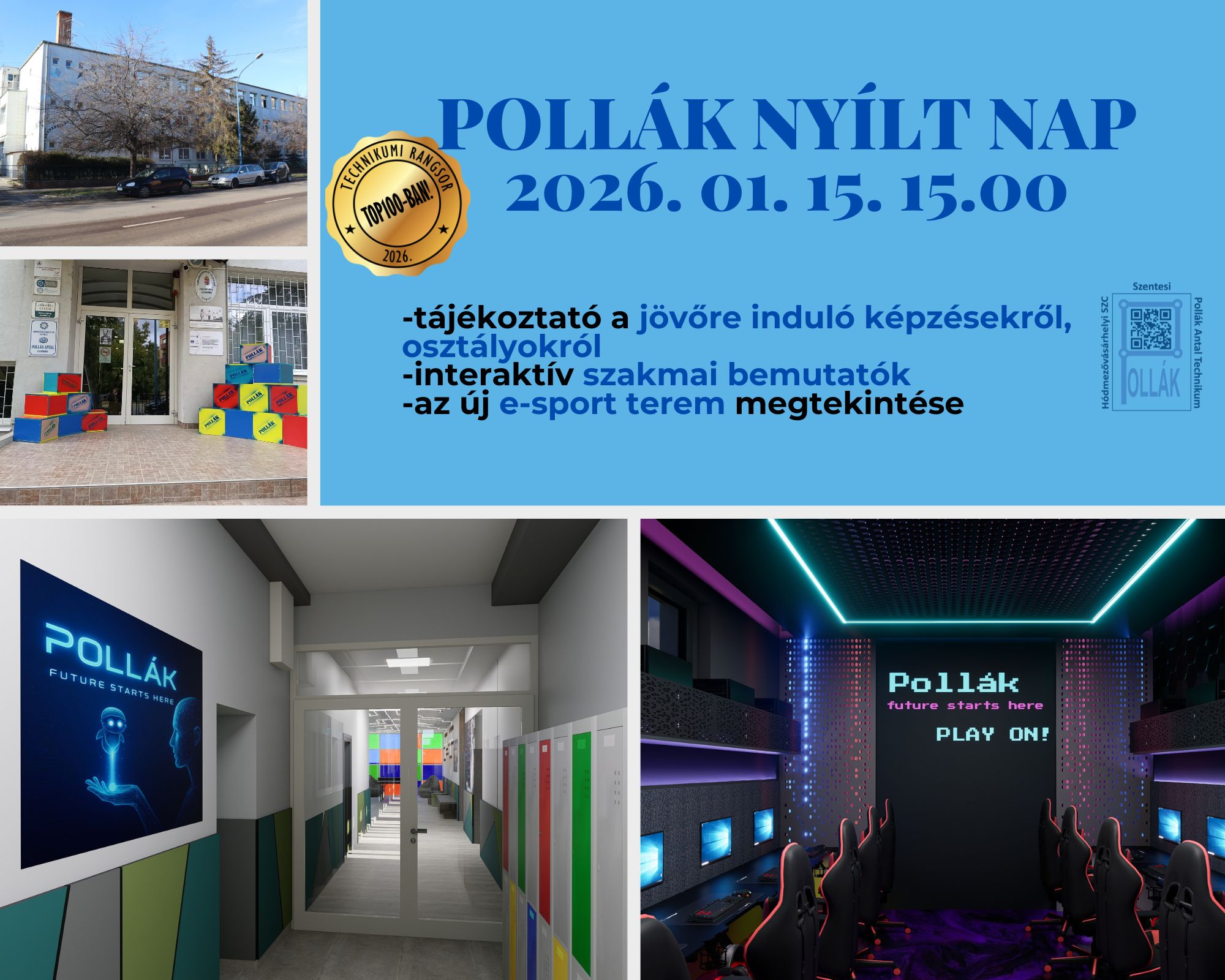 Újra Nyílt Nap a Pollákban! 📢 Segítség a hetedik-nyolcadik osztályos diákok iskolaválasztásához: január 15-én, csütörtökön 15 órakor interaktív szakmai bemutatókkal várjuk az érdeklődőket. A rendezvényen lehetőség nyílik a felújított földszinti épületrész bebarangolására és a most kialakított hipermodern e-sport terem megtekintésére is.