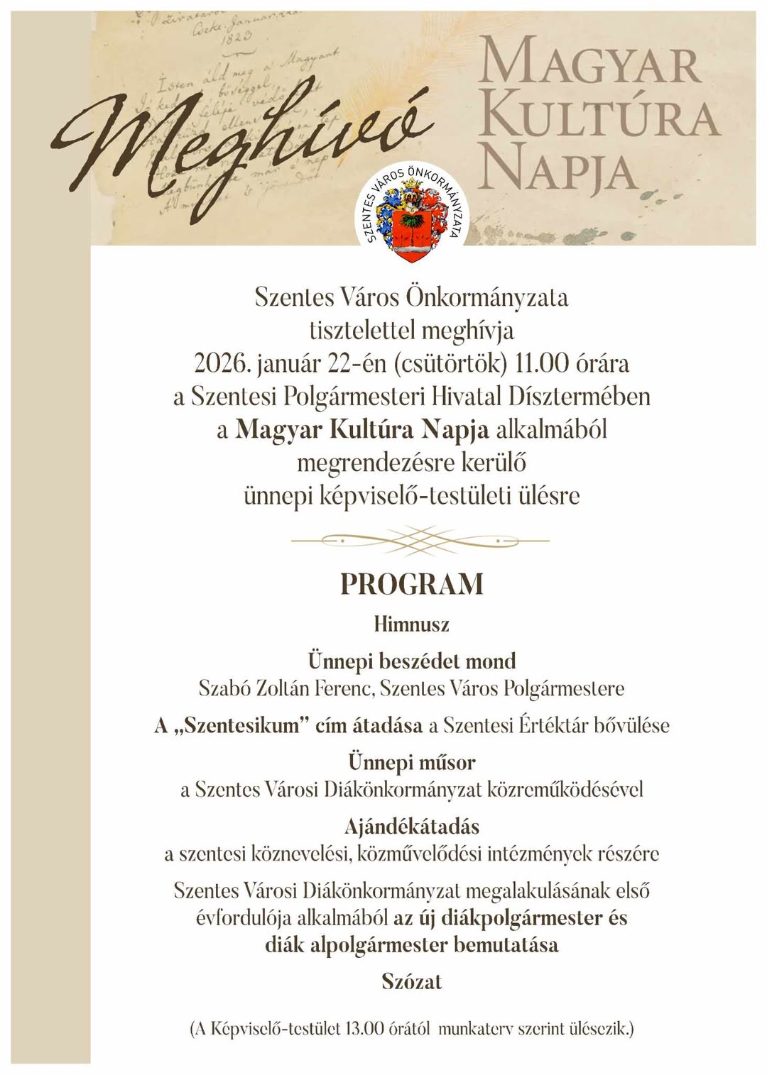 Ünnepi képviselő-testületi ülést tartanak a magyar kultúra napján, melynek keretében újabb „szentesikummal” bővül a Szentesi Értéktár, valamint az új diákpolgármester és az alpolgármester is bemutatkozik.