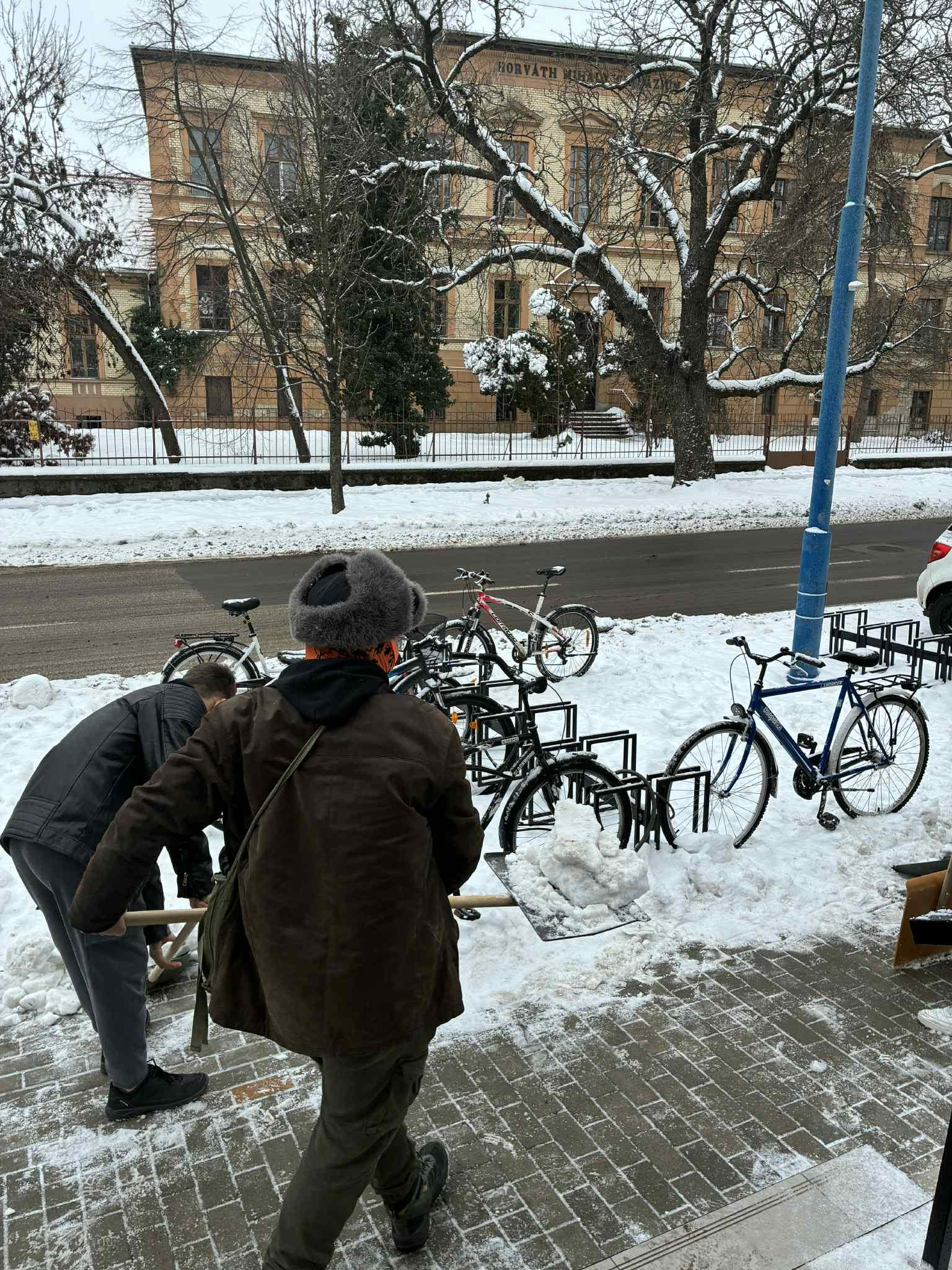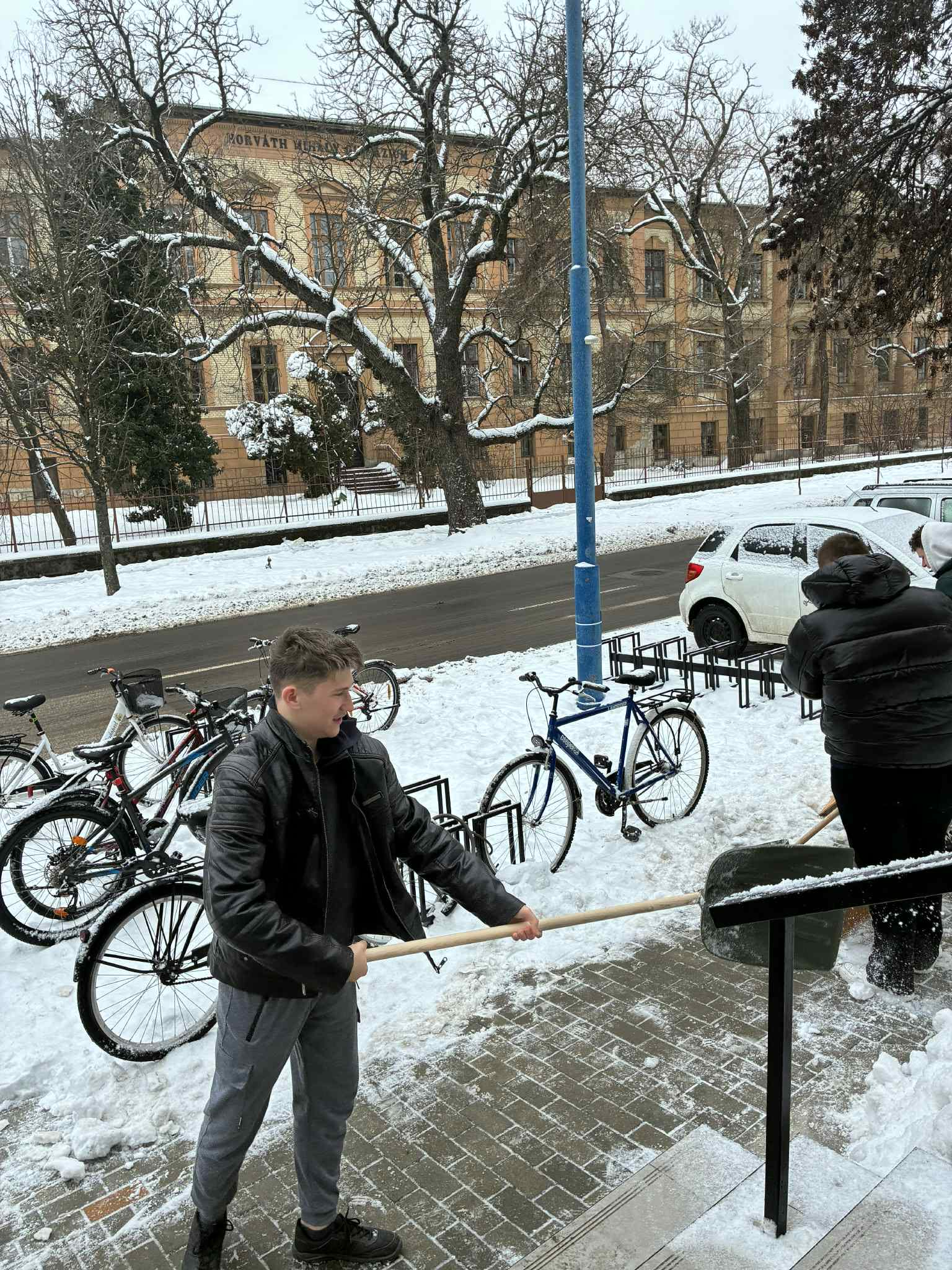 Ezúttal újabb csapatok ragadtak lapátot: 👉 A 9.B osztály tanulói az „A” épület utcai kerékpártárolóját tették rendbe, hogy mindenki biztonságosan parkolhasson. 👉 A 10.B osztály pedig az „A” épület és szomszédos társasház előtti utcaszakaszt varázsolta hótalanítottá, segítve ezzel a környéken közlekedőket.