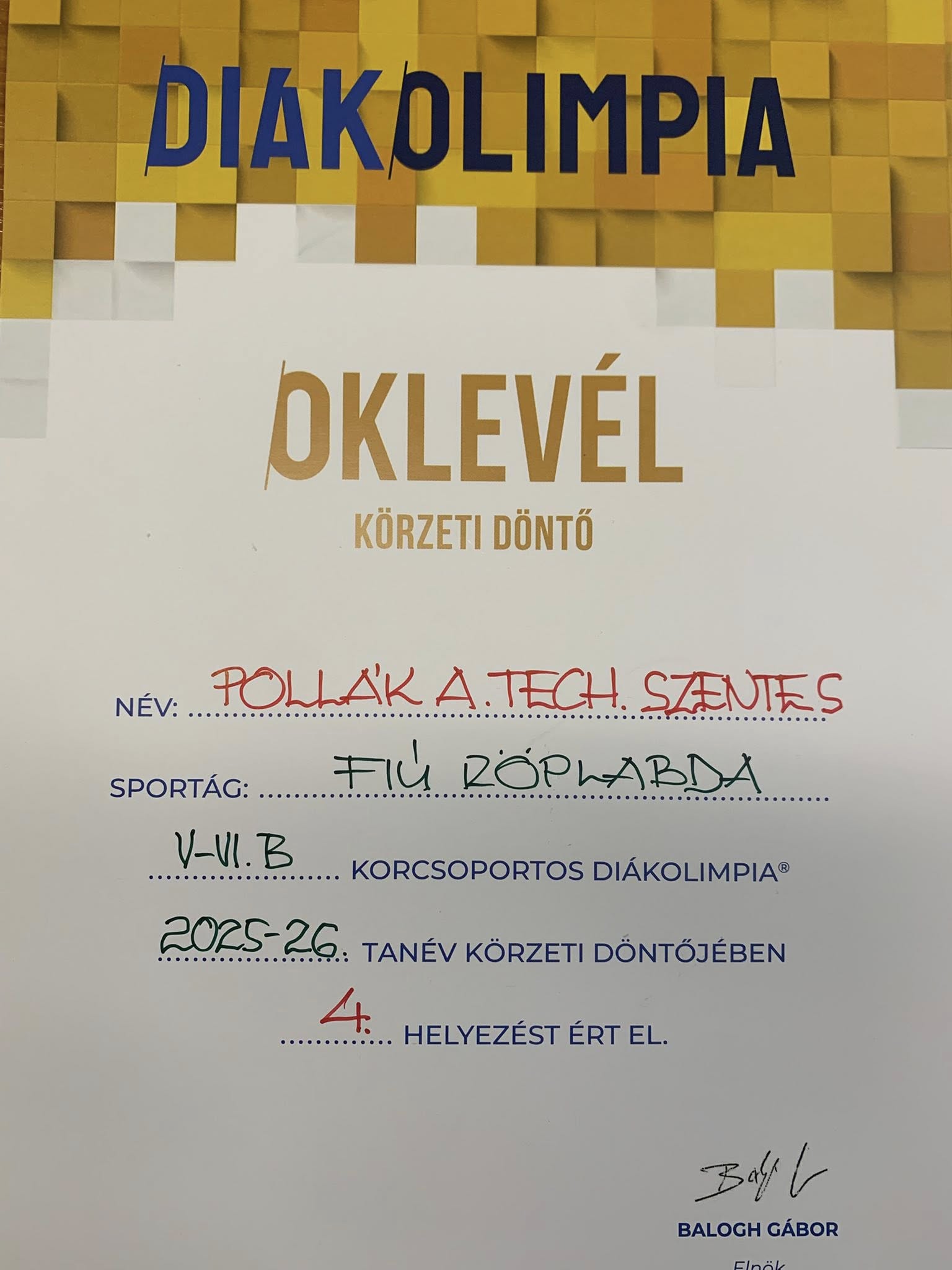 A tanév elején a Pollák csapata jelentősen átalakult, hiszen a végzett diákok helyére új tagokat kellett beépíteni. Ennek ellenére iskolánk benevezett a Diákolimpiára, és ott a december 9-ei és a január 12-ei fordulók alapján, becsületes küzdelemben a körzeti döntőben a 4. helyen végzett. A csapat tagjai: Héri Dániel, Sinka Balázs, Kis Lajos Noel, Mészáros Árpád, Tóth Mór, Tóth Vendel, Zsurka Dávid, Czombos Szebasztián. Köszönjük a diákok és a felkészítő pedagógusok, Rajosné Kozma Katalin és Mácsai László munkáját! 👏🏻