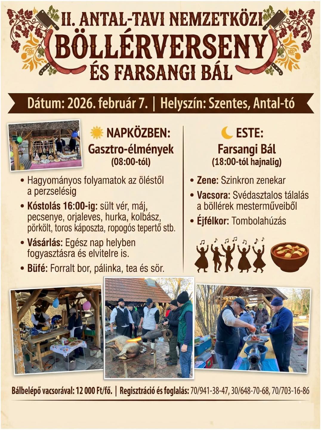 Második alkalommal rendezik meg február 7-én az Antal-tavi Nemzetközi Böllérversenyt és Farsangi bált, amely nem csupán gasztronómiai esemény, hanem a disznóvágás hagyományainak felidézésére is vállalkozik. A vajdasági, bácskai és bánsági ízek a dél-alföldi szokásokkal találkoznak az egész napos program során.