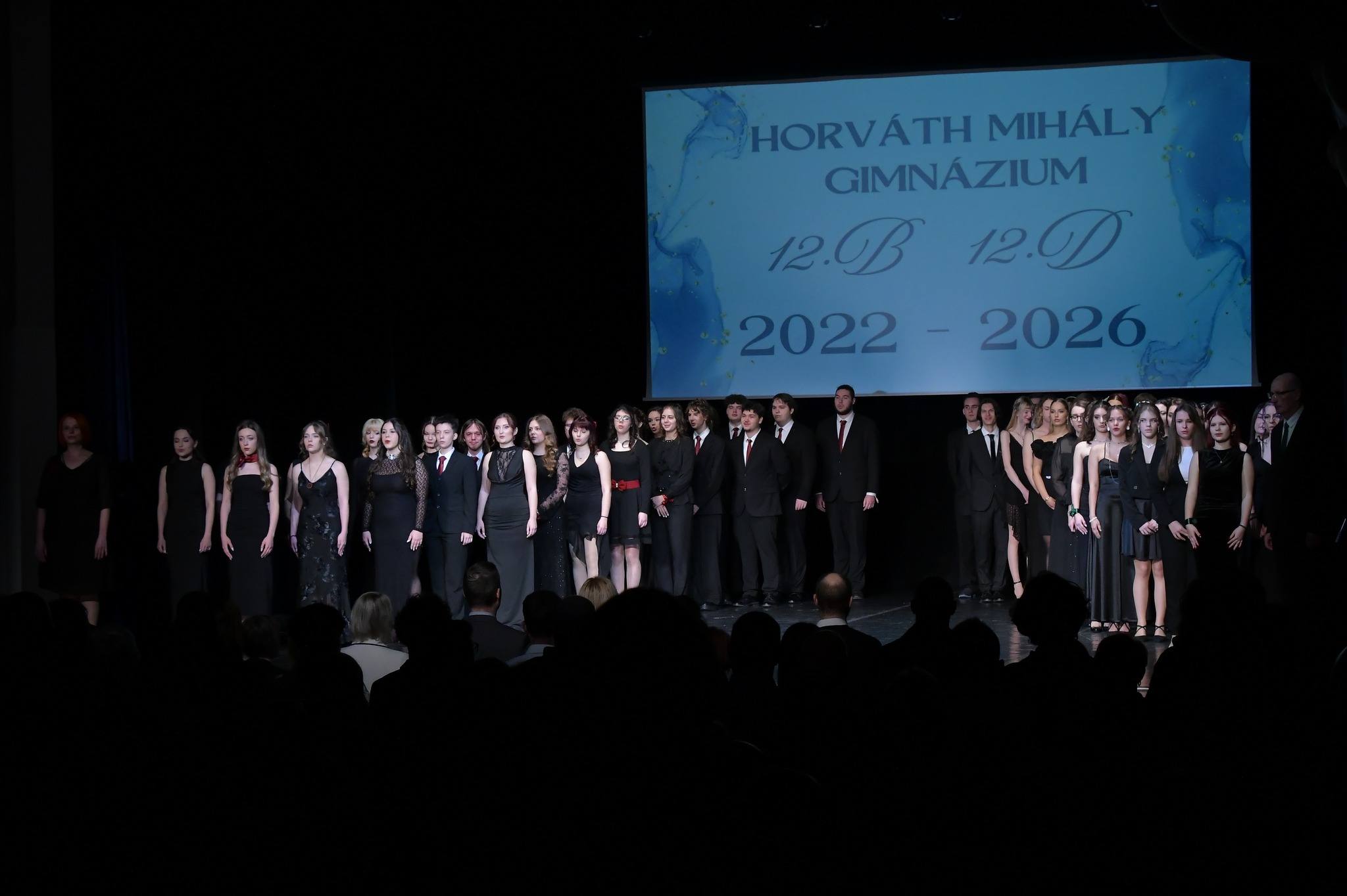 11 órától a Horváth Mihály Gimnázium 12. B és 12. D osztályának diákjai léptek színpadra, hogy megkapják azt a kis szalagot, amely egyszerre jelzi a búcsút és az elindulást.