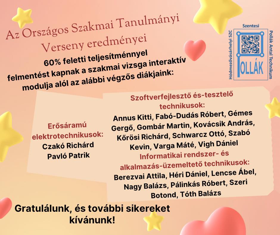 Iskolánk 19 végzős diákja ért el 60% feletti eredményt az Országos Szakmai Tanulmányi Versenyen, így már mindannyian előre teljesítették év végi záróvizsgájuk elméleti részét. Büszkék vagyunk rátok! 😇