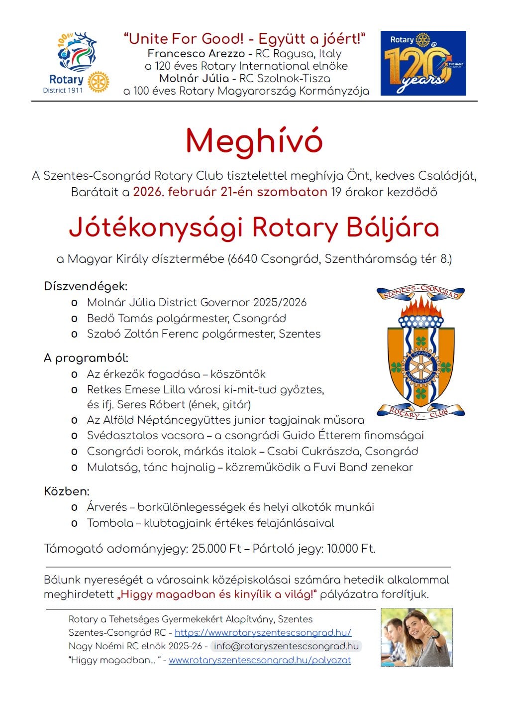 A Szentes-Csongrád Rotary Club tisztelettel meghívja Önt, kedves Családját, Barátait a 2026. február 21-én szombaton 19 órakor kezdődő Jótékonysági Rotary Báljára Csongrádra, a Magyar Király dísztermébe.