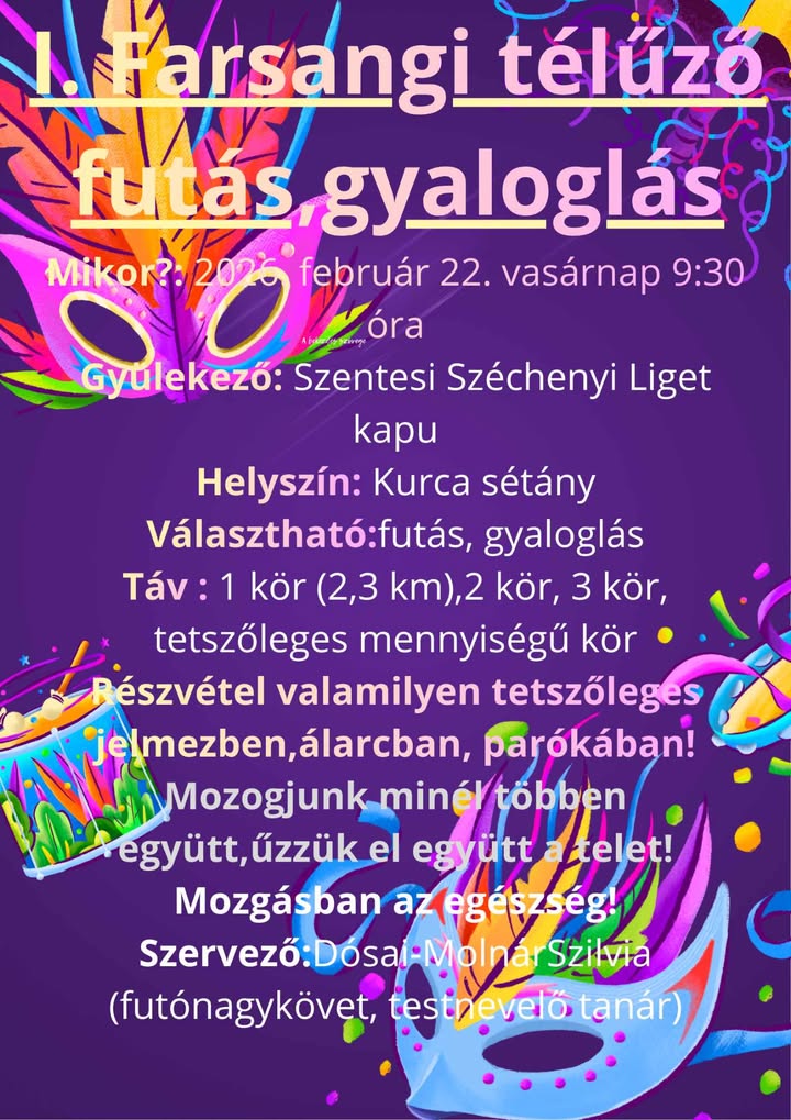 Szeretnék meghívni mindenkit (kicsiket és nagyokat,fiatalokat és időseket) az I. Farsangi télűző futás,gyaloglás programra. 🎊🎉🎭