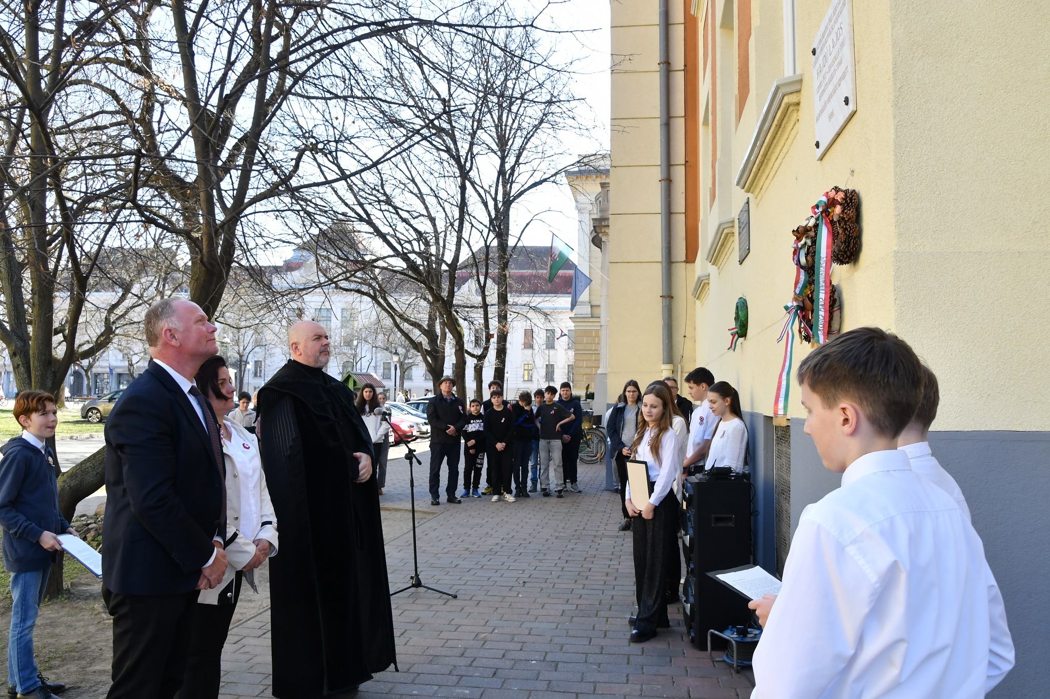 A délelőtti program az iskola falán elhelyezett Hajdú Lajos-emléktáblánál zárult. Hajdú Lajos szentesi születésű tanár-iskolaigazgató volt, aki a 1848-ban olyan lelkesítő beszédet mondott a református iskola ablakából a haza védelmében, hogy hosszú börtönéveket kapott érte. Hazafias életét a hatodikos diákok mutatták be, tevékenységét Fehér Csaba lelkipásztor méltatta. Az ünnepség koszorúzással zárult.