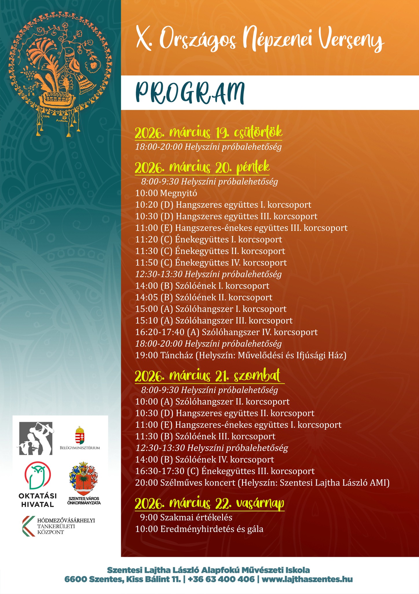 A X. Országos Népzenei Versenyt rendezik meg a Szentesi Lajtha László Alapfokú Művészeti Iskolában március 20-22. között. A hangszeres és énekes versenyeket követően táncház és koncert is színesíti a programot, az eredményhirdetést és a gálát vasárnap délelőtt tartják.