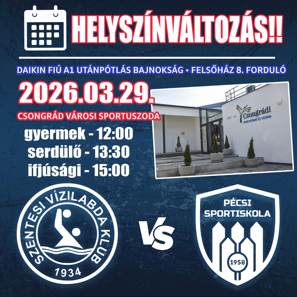 Tájékoztatjuk a szurkolókat, hogy a Daikin A1-es fiú utánpótlás bajnokság hétvégi fordulójának mérkőzéseit csapataink a Csongrád Városi Sportuszodában játszák le, az alábbi időpontokban.