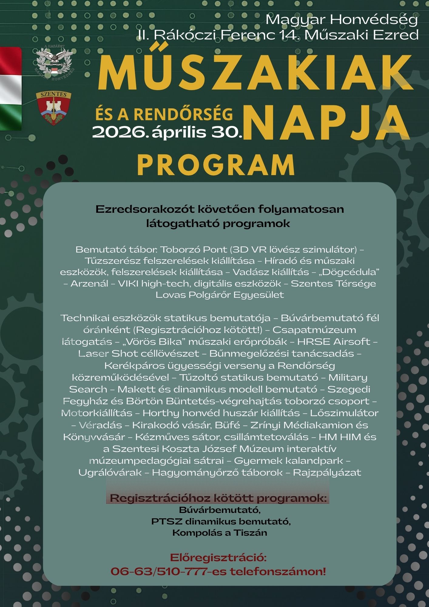 Izgalmasnak ígérkezik az idei április vége Szentesen: 2026. április 30-án a Magyar Honvédség II. Rákóczi Ferenc 14. Műszaki Ezrede ismét megnyitja kapuit a nagyközönség előtt a Damjanich laktanyában. A reggel 7:30-as kapunyitást követően egy rendkívül sűrű és látványos programsorozat veszi kezdetét, ahol a technikai eszközök statikus és dinamikus bemutatói mellett a rendőrség, a katasztrófavédelem és a büntetés-végrehajtás munkájába is betekintést nyerhetnek az érdeklődők.