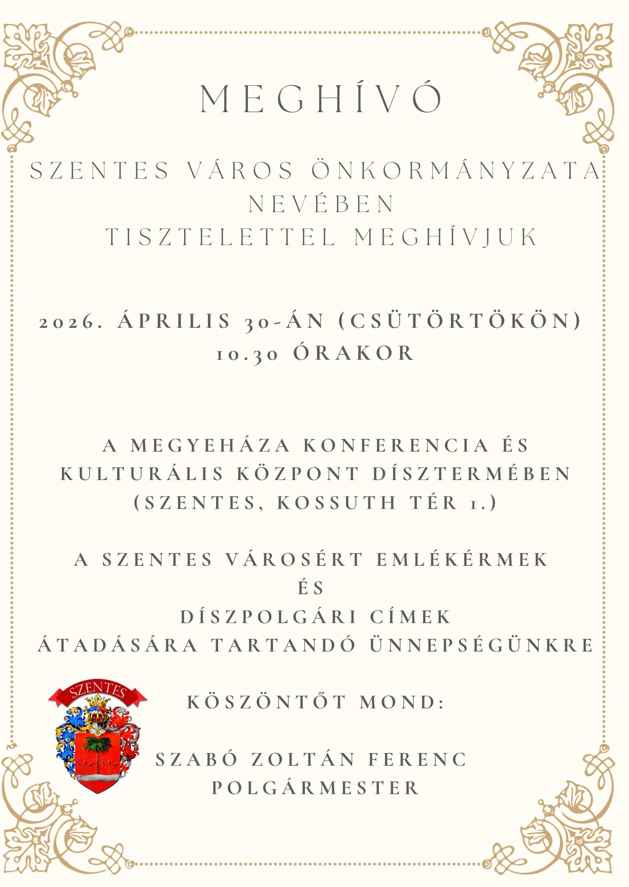 Ünnepi testületi ülésen adják át a díszpolgári címeket és a Szentes Városért Emlékérmeket április 30-án 10. 30-kor a megyeháza dísztermében.