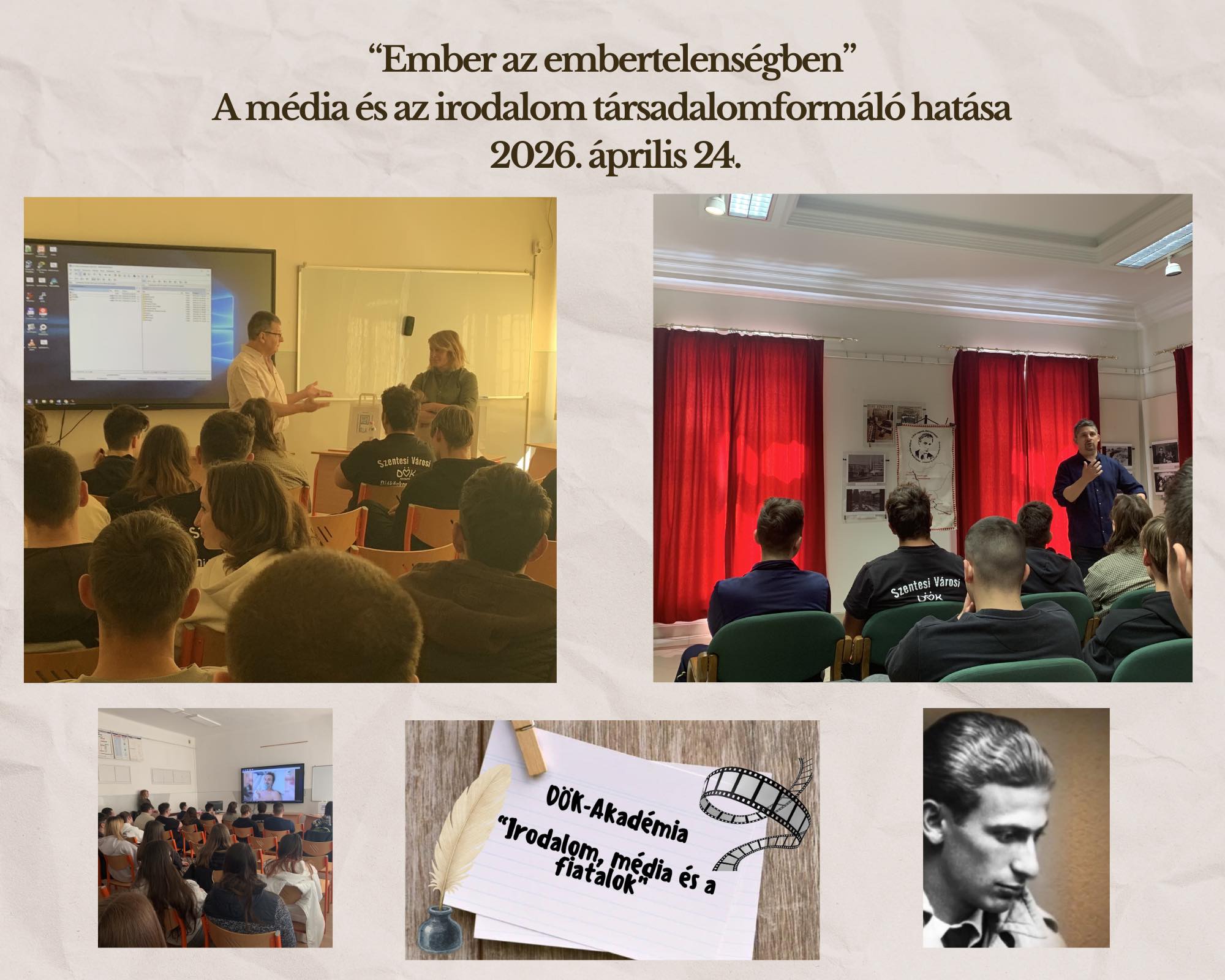A Pollák, a Boros és a Zsoldos együttműködésében megvalósuló színvonalas programsorozat ötödik rendezvényét ismét iskolánk szervezte meg. Negyvenöt középiskolás diákot várt az a műhelymunka, amely a média és az irodalom társadalomformáló hatását igyekezett bemutatni. Először Börcsök Noémi, a Szentes TV munkatársa tartott saját riportjaival illusztrált beszámolót arról, hogyan lehet emberi sorsok megfilmesítésén keresztül értéket teremteni. Ezt követően Tóth Péter Lóránt, az országszerte ismert “Versvándor” Radnóti-emlékműsorán keresztül tapasztalhattuk meg a versek emberfeletti erejét “Lélek vagyok. Élni szeretnék!” címmel. Köszönjük a találkozást, a gondolatok és érzelmek gazdagságát az előadóknak, illetve a második programelemhez a helyszín biztosítását a Szentes Városi Könyvtárnak!