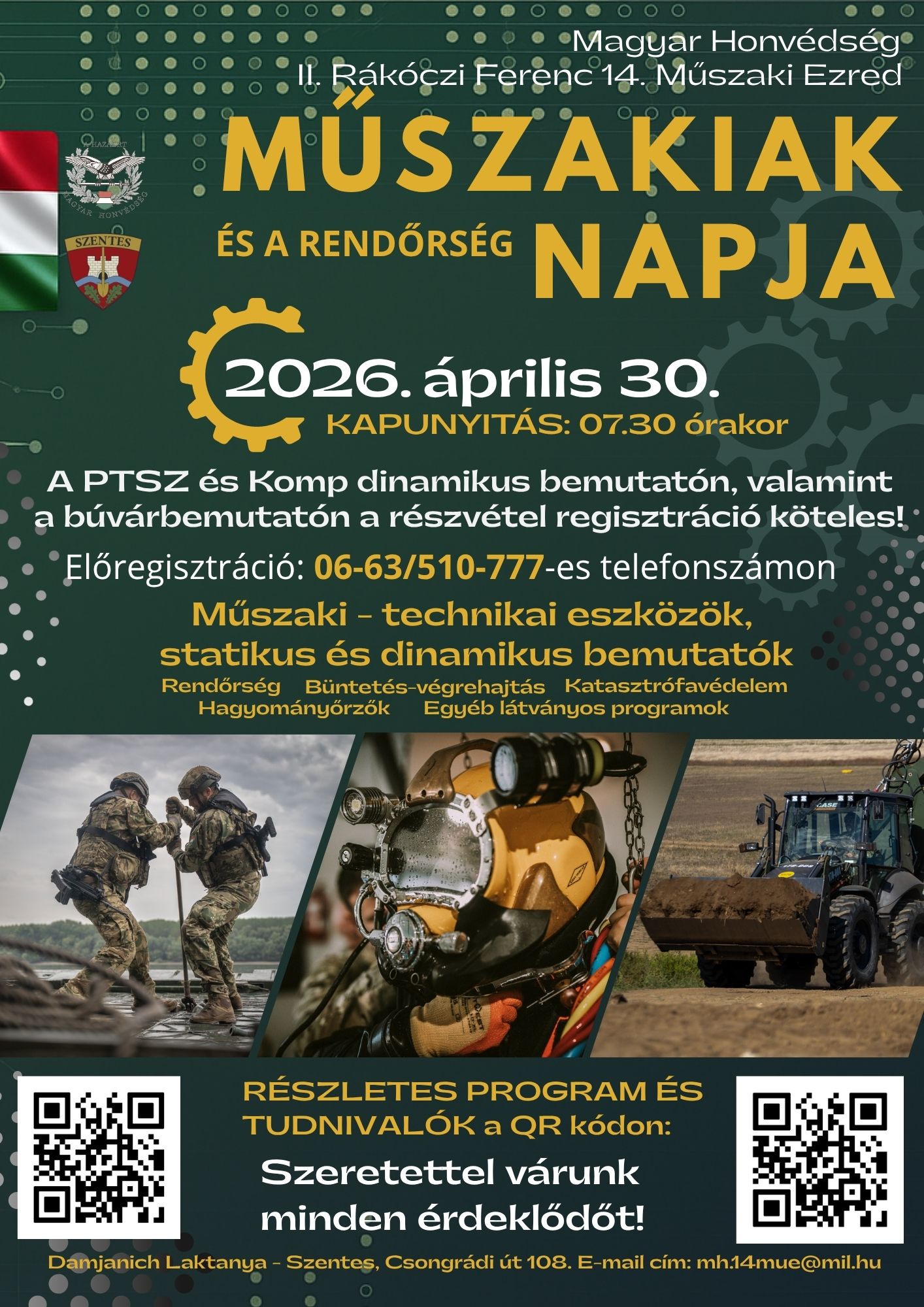 Április 30-án, csütörtökön reggel fél 8-kor kinyílik a műszaki ezred kapuja, ahol felvonul a teljes arzenál, és látványos bemutatókkal, szórakoztató programokkal várja az érdeklődőket a honvédség és a rendőrség.