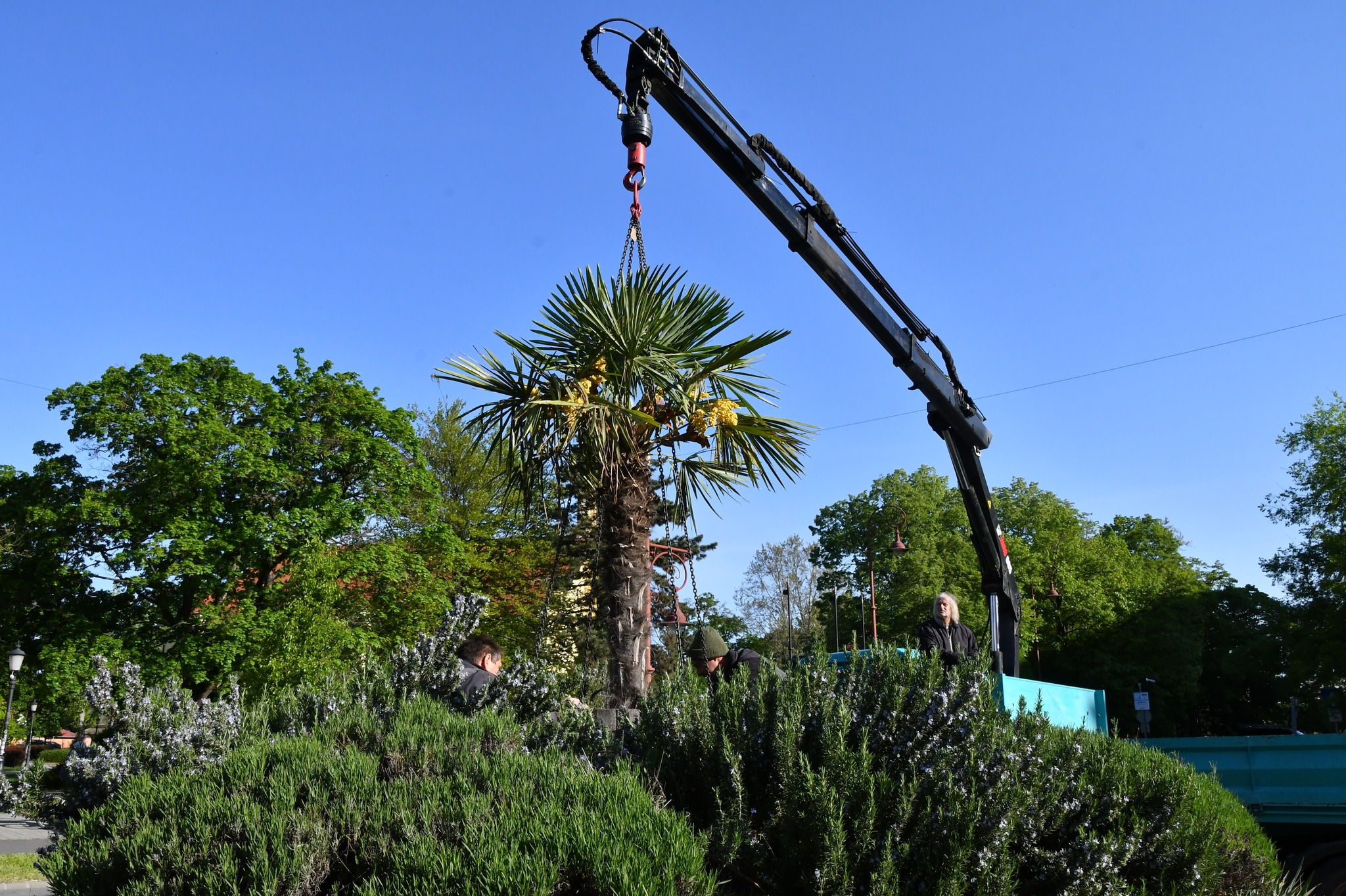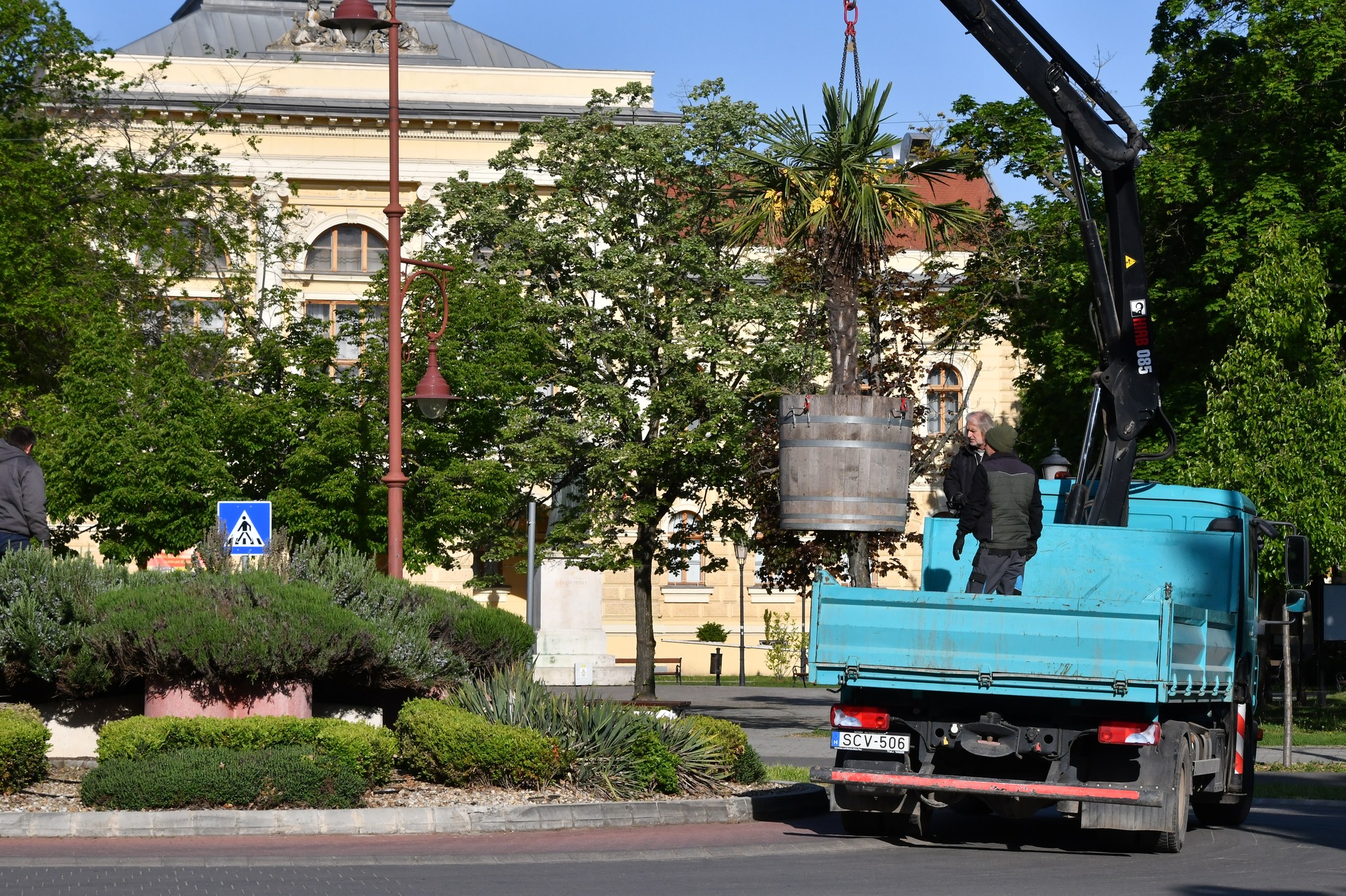 Szentes főterén, a Kossuth téren járók péntek reggel óta ismét egy nem mindennapi látványban gyönyörködhetnek: április 24-én a kora reggeli órákban visszakerült helyére a város híres pálmafája.