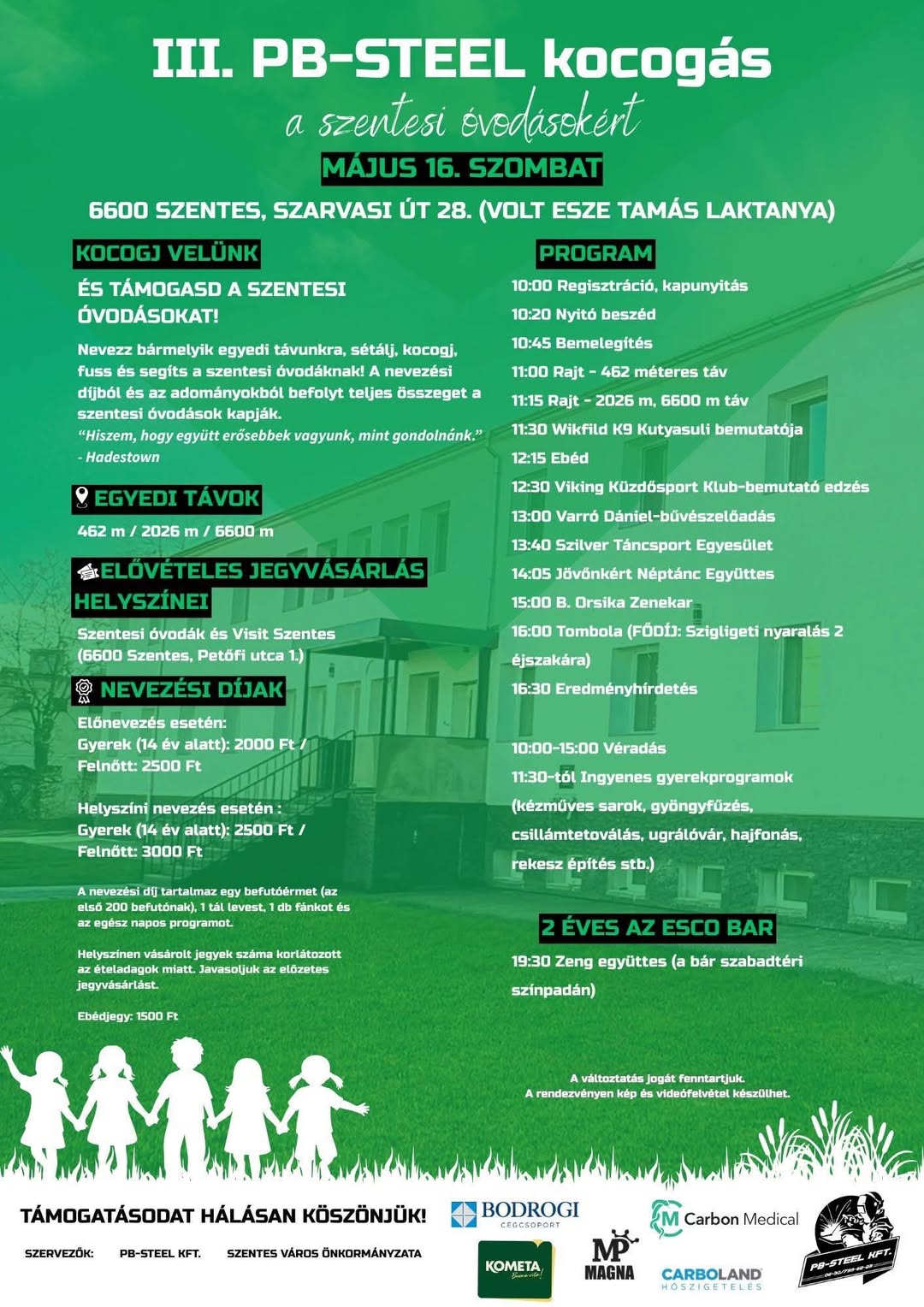 A PB-Steel Kft. idén is folytatja hagyományát: május 16-án ismét jótékonysági futást szervez, amelynek célja a helyi óvodások támogatása. A résztvevők többféle táv közül választhatnak, például a 462 métert (Szentes városának kora), a 2026 métert (az aktuális évszám), vagy a 6600 métert (Szentes irányítószáma).