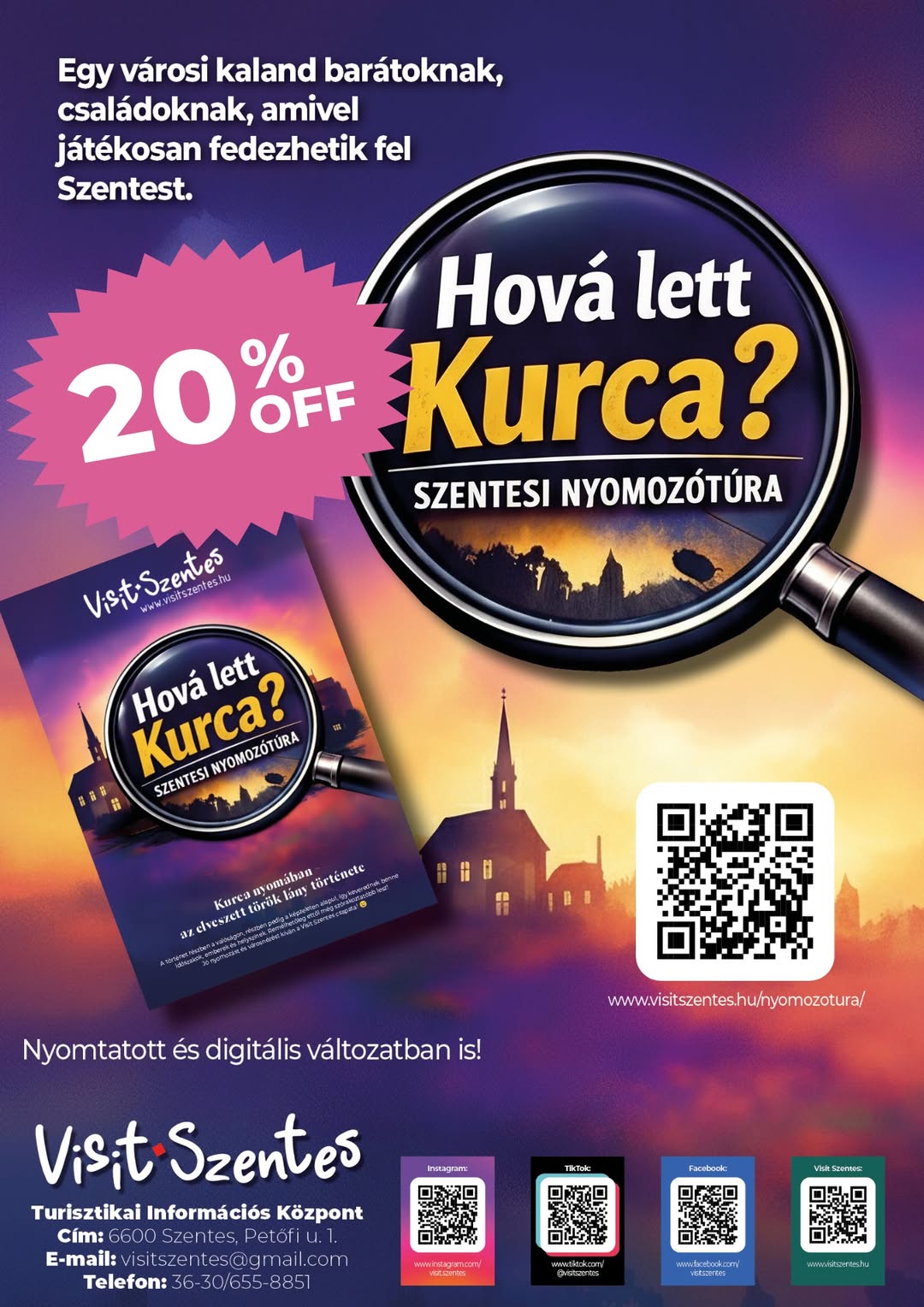 Május 1–2. között 20% kedvezménnyel szerezhetik be a „Hová lett Kurca?” szentesi nyomozótúrát a Városnapok alatt, az Ifjúsági Parkban (gödör)! 🎉